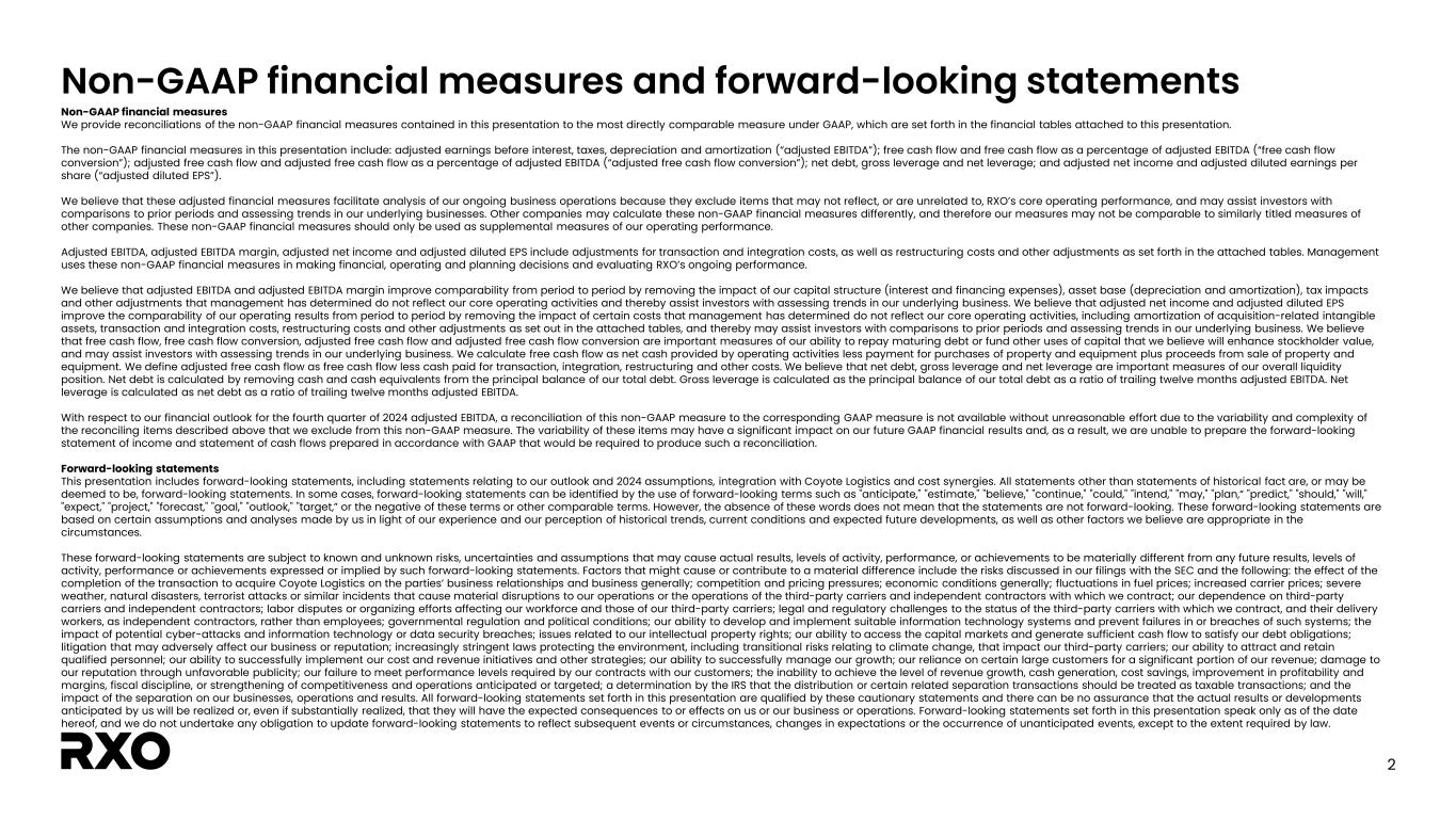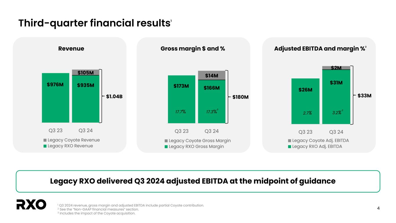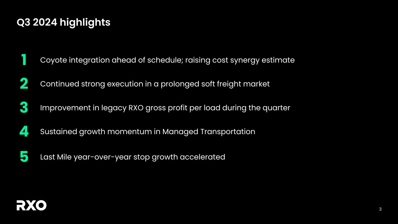 2 Non-GAAP financial measures and forward-looking statements Non-GAAP financial measures We provide reconciliations of the non-GAAP financial measures contained in this presentation to the most directly comparable measure under GAAP, which are set forth in the financial tables attached to this presentation. The non-GAAP financial measures in this presentation include: adjusted earnings before interest, taxes, depreciation and amortization (“adjusted EBITDA”); free cash flow and free cash flow as a percentage of adjusted EBITDA (“free cash flow conversion”); adjusted free cash flow and adjusted free cash flow as a percentage of adjusted EBITDA (“adjusted free cash flow conversion”); net debt, gross leverage and net leverage; and adjusted net income and adjusted diluted earnings per share (“adjusted diluted EPS”). We believe that these adjusted financial measures facilitate analysis of our ongoing business operations because they exclude items that may not reflect, or are unrelated to, RXO’s core operating performance, and may assist investors with comparisons to prior periods and assessing trends in our underlying businesses. Other companies may calculate these non-GAAP financial measures differently, and therefore our measures may not be comparable to similarly titled measures of other companies. These non-GAAP financial measures should only be used as supplemental measures of our operating performance. Adjusted EBITDA, adjusted EBITDA margin, adjusted net income and adjusted diluted EPS include adjustments for transaction and integration costs, as well as restructuring costs and other adjustments as set forth in the attached tables. Management uses these non-GAAP financial measures in making financial, operating and planning decisions and evaluating RXO’s ongoing performance. We believe that adjusted EBITDA and adjusted EBITDA margin improve comparability from period to period by removing the impact of our capital structure (interest and financing expenses), asset base (depreciation and amortization), tax impacts and other adjustments that management has determined do not reflect our core operating activities and thereby assist investors with assessing trends in our underlying business. We believe that adjusted net income and adjusted diluted EPS improve the comparability of our operating results from period to period by removing the impact of certain costs that management has determined do not reflect our core operating activities, including amortization of acquisition-related intangible assets, transaction and integration costs, restructuring costs and other adjustments as set out in the attached tables, and thereby may assist investors with comparisons to prior periods and assessing trends in our underlying business. We believe that free cash flow, free cash flow conversion, adjusted free cash flow and adjusted free cash flow conversion are important measures of our ability to repay maturing debt or fund other uses of capital that we believe will enhance stockholder value, and may assist investors with assessing trends in our underlying business. We calculate free cash flow as net cash provided by operating activities less payment for purchases of property and equipment plus proceeds from sale of property and equipment. We define adjusted free cash flow as free cash flow less cash paid for transaction, integration, restructuring and other costs. We believe that net debt, gross leverage and net leverage are important measures of our overall liquidity position. Net debt is calculated by removing cash and cash equivalents from the principal balance of our total debt. Gross leverage is calculated as the principal balance of our total debt as a ratio of trailing twelve months adjusted EBITDA. Net leverage is calculated as net debt as a ratio of trailing twelve months adjusted EBITDA. With respect to our financial outlook for the fourth quarter of 2024 adjusted EBITDA, a reconciliation of this non-GAAP measure to the corresponding GAAP measure is not available without unreasonable effort due to the variability and complexity of the reconciling items described above that we exclude from this non-GAAP measure. The variability of these items may have a significant impact on our future GAAP financial results and, as a result, we are unable to prepare the forward-looking statement of income and statement of cash flows prepared in accordance with GAAP that would be required to produce such a reconciliation. Forward-looking statements This presentation includes forward-looking statements, including statements relating to our outlook and 2024 assumptions, integration with Coyote Logistics and cost synergies. All statements other than statements of historical fact are, or may be deemed to be, forward-looking statements. In some cases, forward-looking statements can be identified by the use of forward-looking terms such as "anticipate," "estimate," "believe," "continue," "could," "intend," "may," "plan,“ "predict," "should," "will," "expect," "project," "forecast," "goal," "outlook," "target,” or the negative of these terms or other comparable terms. However, the absence of these words does not mean that the statements are not forward-looking. These forward-looking statements are based on certain assumptions and analyses made by us in light of our experience and our perception of historical trends, current conditions and expected future developments, as well as other factors we believe are appropriate in the circumstances. These forward-looking statements are subject to known and unknown risks, uncertainties and assumptions that may cause actual results, levels of activity, performance, or achievements to be materially different from any future results, levels of activity, performance or achievements expressed or implied by such forward-looking statements. Factors that might cause or contribute to a material difference include the risks discussed in our filings with the SEC a
