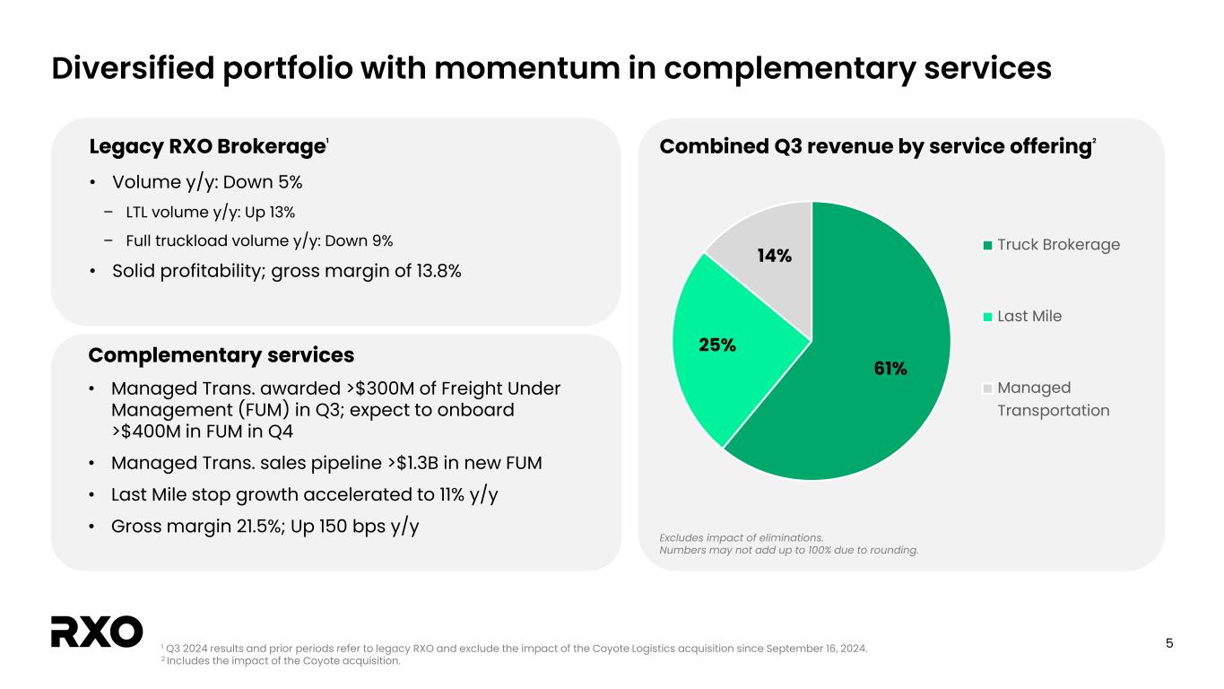 4 $173M $166M $14M Q3 23 Q3 24 Legacy Coyote Gross Margin Legacy RXO Gross Margin Third-quarter financial results1 Legacy RXO delivered Q3 2024 adjusted EBITDA at the midpoint of guidance Adjusted EBITDA and margin %2Gross margin $ and % 1 Q3 2024 revenue, gross margin and adjusted EBITDA include partial Coyote contribution. 2 See the “Non-GAAP financial measures” section. 3 Includes the impact of the Coyote acquisition. $26M $31M $2M Q3 23 Q3 24 Legacy Coyote Adj. EBITDA Legacy RXO Adj. EBITDA 2.7% 3.2%17.7% $180M $33M Revenue $976M $935M $105M Q3 23 Q3 24 Legacy Coyote Revenue Legacy RXO Revenue $1.04B 3 317.3%