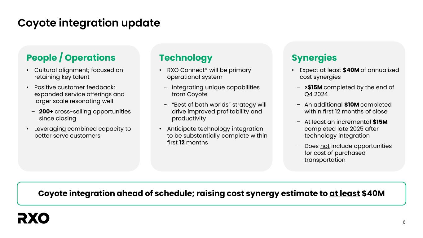 5 Diversified portfolio with momentum in complementary services Combined Q3 revenue by service offering2 61% 25% 14% Truck Brokerage Last Mile Managed Transportation Excludes impact of eliminations. Numbers may not add up to 100% due to rounding. Legacy RXO Brokerage1 • Volume y/y: Down 5% – LTL volume y/y: Up 13% – Full truckload volume y/y: Down 9% • Solid profitability; gross margin of 13.8% Complementary services • Managed Trans. awarded >$300M of Freight Under Management (FUM) in Q3; expect to onboard >$400M in FUM in Q4 • Managed Trans. sales pipeline >$1.3B in new FUM • Last Mile stop growth accelerated to 11% y/y • Gross margin 21.5%; Up 150 bps y/y 1 Q3 2024 results and prior periods refer to legacy RXO and exclude the impact of the Coyote Logistics acquisition since September 16, 2024. 2 Includes the impact of the Coyote acquisition.
