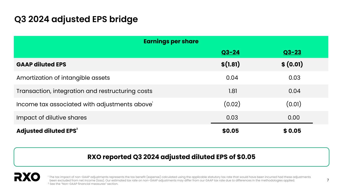 6 Coyote integration update People / Operations • Cultural alignment; focused on retaining key talent • Positive customer feedback; expanded service offerings and larger scale resonating well – 200+ cross-selling opportunities since closing • Leveraging combined capacity to better serve customers Coyote integration ahead of schedule; raising cost synergy estimate to at least $40M Technology • RXO Connect® will be primary operational system - Integrating unique capabilities from Coyote - “Best of both worlds” strategy will drive improved profitability and productivity • Anticipate technology integration to be substantially complete within first 12 months Synergies • Expect at least $40M of annualized cost synergies – >$15M completed by the end of Q4 2024 – An additional $10M completed within first 12 months of close – At least an incremental $15M completed late 2025 after technology integration – Does not include opportunities for cost of purchased transportation