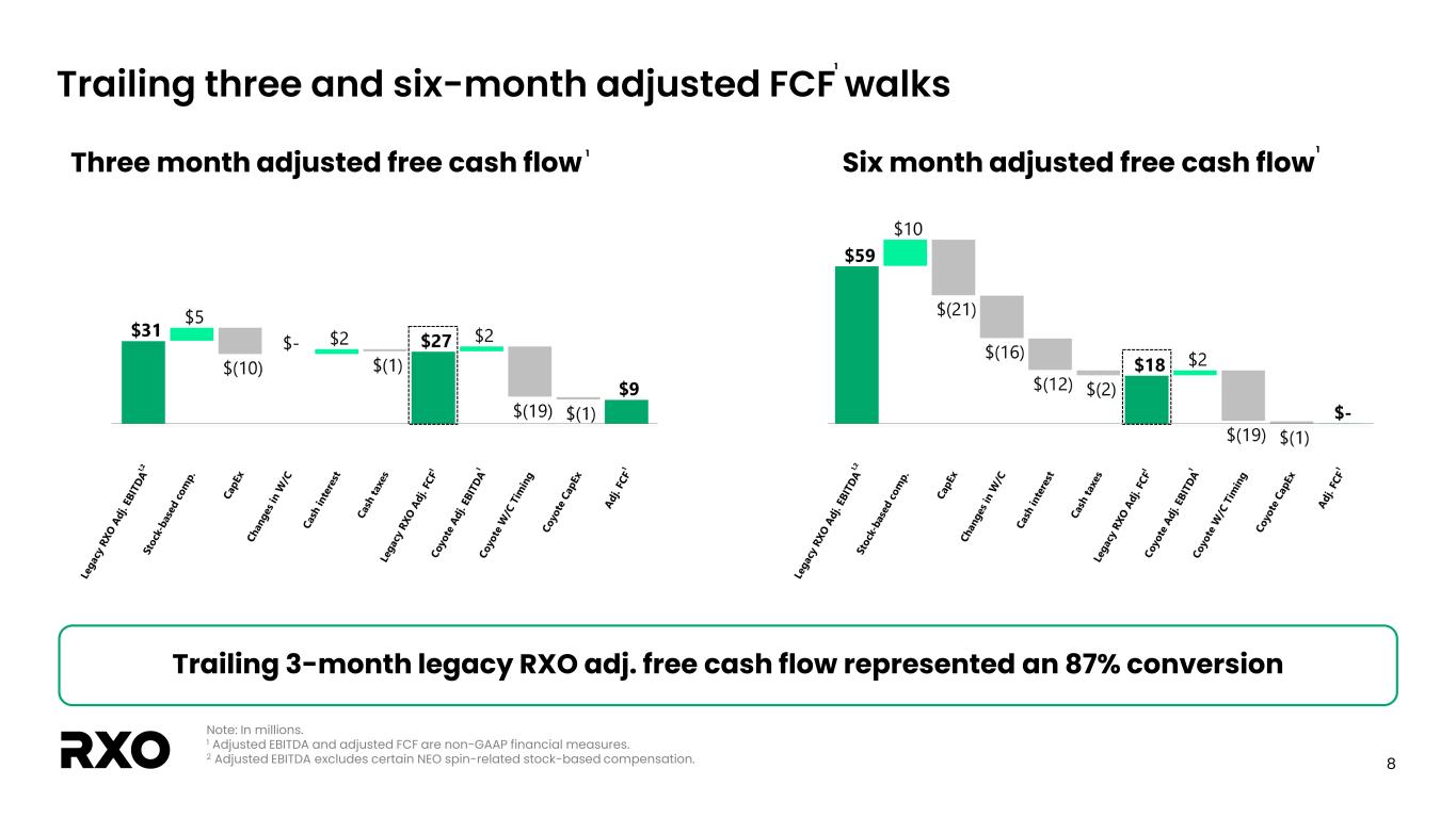 7 Q3 2024 adjusted EPS bridge Earnings per share Q3-24 Q3-23 GAAP diluted EPS $(1.81) $ (0.01) Amortization of intangible assets 0.04 0.03 Transaction, integration and restructuring costs 1.81 0.04 Income tax associated with adjustments above1 (0.02) (0.01) Impact of dilutive shares 0.03 0.00 Adjusted diluted EPS2 $0.05 $ 0.05 RXO reported Q3 2024 adjusted diluted EPS of $0.05 1 The tax impact of non-GAAP adjustments represents the tax benefit (expense) calculated using the applicable statutory tax rate that would have been incurred had these adjustments been excluded from net income (loss). Our estimated tax rate on non-GAAP adjustments may differ from our GAAP tax rate due to differences in the methodologies applied. 2 See the “Non-GAAP financial measures” section.
