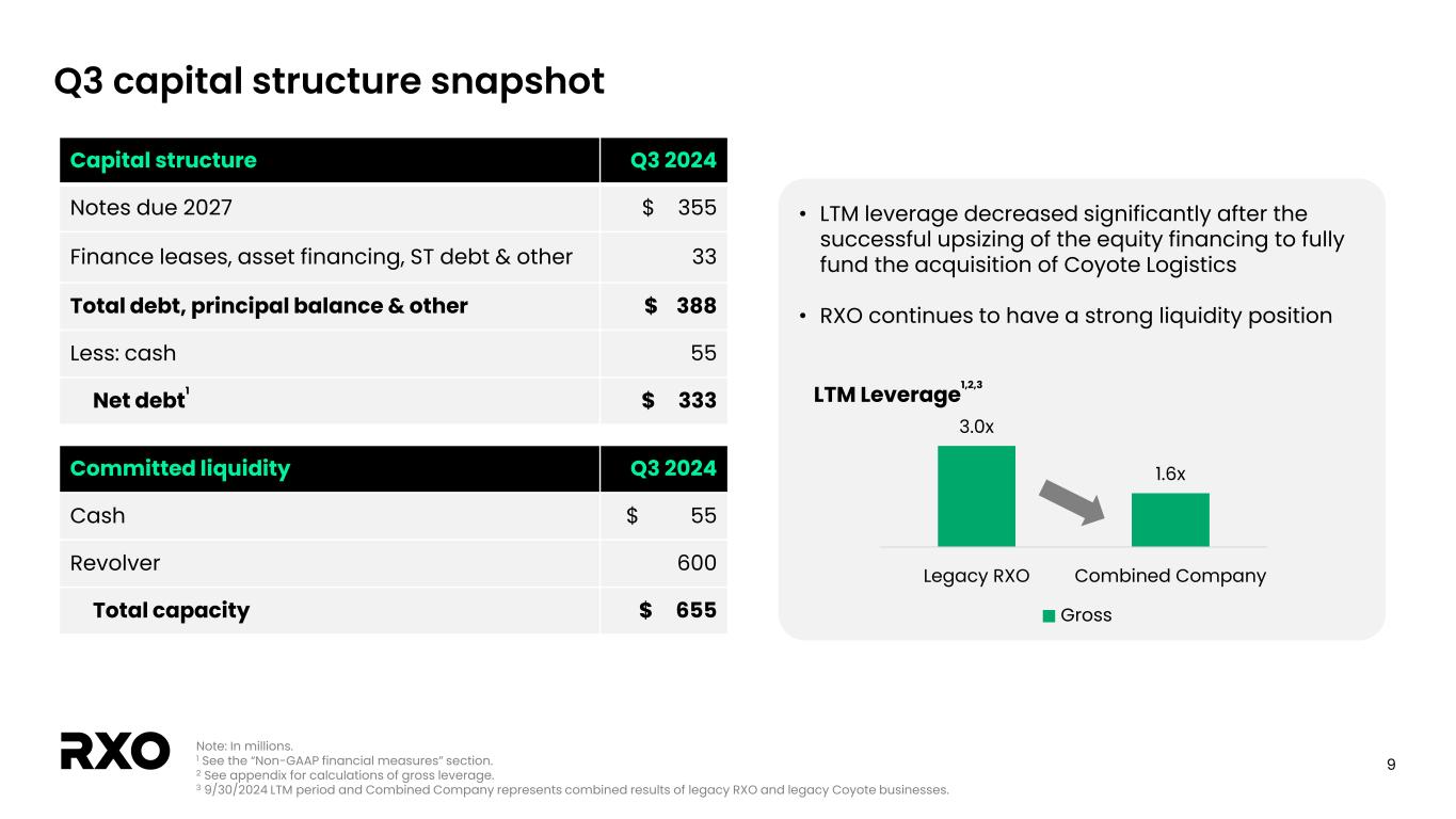 8 Trailing three and six-month adjusted FCF walks Note: In millions. 1 Adjusted EBITDA and adjusted FCF are non-GAAP financial measures. 2 Adjusted EBITDA excludes certain NEO spin-related stock-based compensation. Trailing 3-month legacy RXO adj. free cash flow represented an 87% conversion Six month adjusted free cash flow 1 Three month adjusted free cash flow 1 1