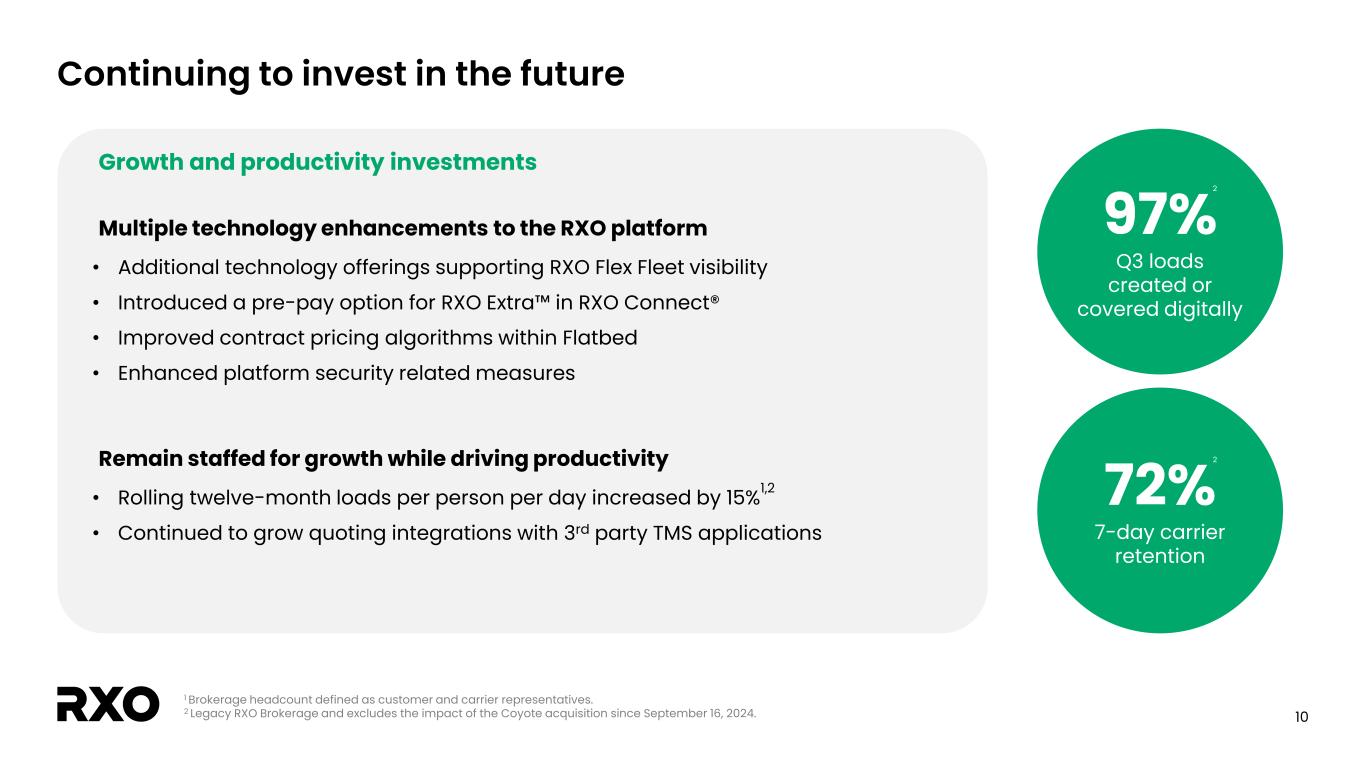 9 Q3 capital structure snapshot Capital structure Q3 2024 Notes due 2027 $ 355 Finance leases, asset financing, ST debt & other 33 Total debt, principal balance & other $ 388 Less: cash 55 Net debt1 $ 333 Committed liquidity Q3 2024 Cash $ 55 Revolver 600 Total capacity $ 655 Note: In millions. 1 See the “Non-GAAP financial measures” section. 2 See appendix for calculations of gross leverage. 3 9/30/2024 LTM period and Combined Company represents combined results of legacy RXO and legacy Coyote businesses. • LTM leverage decreased significantly after the successful upsizing of the equity financing to fully fund the acquisition of Coyote Logistics • RXO continues to have a strong liquidity position LTM Leverage1,2,3 3.0x 1.6x Legacy RXO Combined Company Gross