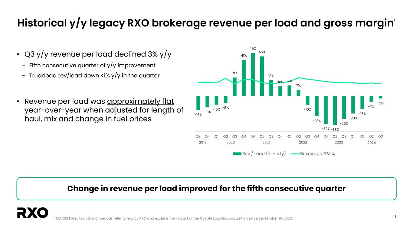10 Continuing to invest in the future 1 Brokerage headcount defined as customer and carrier representatives. 2 Legacy RXO Brokerage and excludes the impact of the Coyote acquisition since September 16, 2024. Growth and productivity investments Multiple technology enhancements to the RXO platform • Additional technology offerings supporting RXO Flex Fleet visibility • Introduced a pre-pay option for RXO Extra™ in RXO Connect® • Improved contract pricing algorithms within Flatbed • Enhanced platform security related measures Remain staffed for growth while driving productivity • Rolling twelve-month loads per person per day increased by 15%1,2 • Continued to grow quoting integrations with 3rd party TMS applications 97% Q3 loads created or covered digitally 72% 7-day carrier retention 2 2