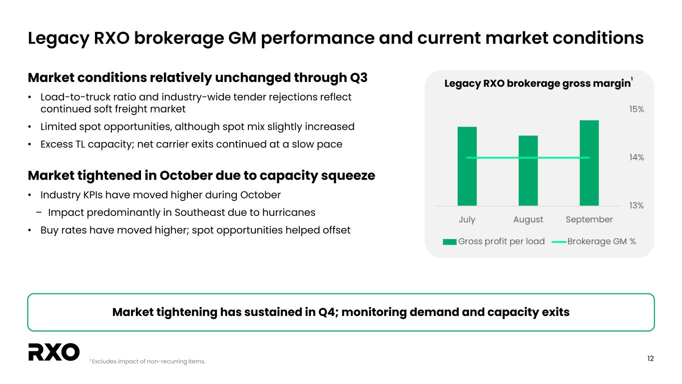 11 -16% -13% -10% -8% 21% 41% 49% 45% 18% 11% 12% 7% -10% -23% -32% -33% -26% -20% -15% -7% -3% Q3 Q4 Q1 Q2 Q3 Q4 Q1 Q2 Q3 Q4 Q1 Q2 Q3 Q4 Q1 Q2 Q3 Q4 Q1 Q2 Q3 Rev / Load (% △ y/y) Brokerage GM % Historical y/y legacy RXO brokerage revenue per load and gross margin1 Change in revenue per load improved for the fifth consecutive quarter • Q3 y/y revenue per load declined 3% y/y – Fifth consecutive quarter of y/y improvement – Truckload rev/load down <1% y/y in the quarter • Revenue per load was approximately flat year-over-year when adjusted for length of haul, mix and change in fuel prices 2019 2020 2021 2022 2023 2024 1 Q3 2024 results and prior periods refer to legacy RXO and exclude the impact of the Coyote Logistics acquisition since September 16, 2024.