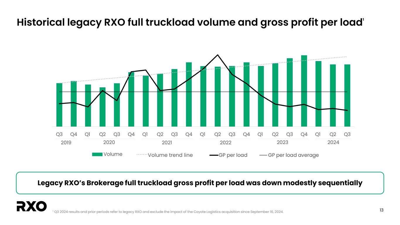 12 Legacy RXO brokerage GM performance and current market conditions Market tightening has sustained in Q4; monitoring demand and capacity exits Market conditions relatively unchanged through Q3 • Load-to-truck ratio and industry-wide tender rejections reflect continued soft freight market • Limited spot opportunities, although spot mix slightly increased • Excess TL capacity; net carrier exits continued at a slow pace Market tightened in October due to capacity squeeze • Industry KPIs have moved higher during October – Impact predominantly in Southeast due to hurricanes • Buy rates have moved higher; spot opportunities helped offset Legacy RXO brokerage gross margin1 1 Excludes impact of non-recurring items.
