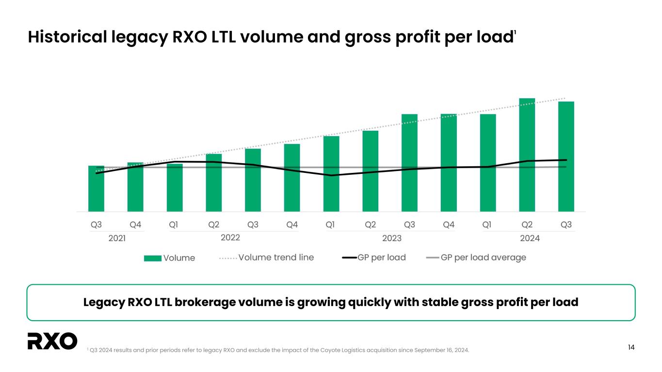 13 Historical legacy RXO full truckload volume and gross profit per load1 Legacy RXO’s Brokerage full truckload gross profit per load was down modestly sequentially 1 Q3 2024 results and prior periods refer to legacy RXO and exclude the impact of the Coyote Logistics acquisition since September 16, 2024.