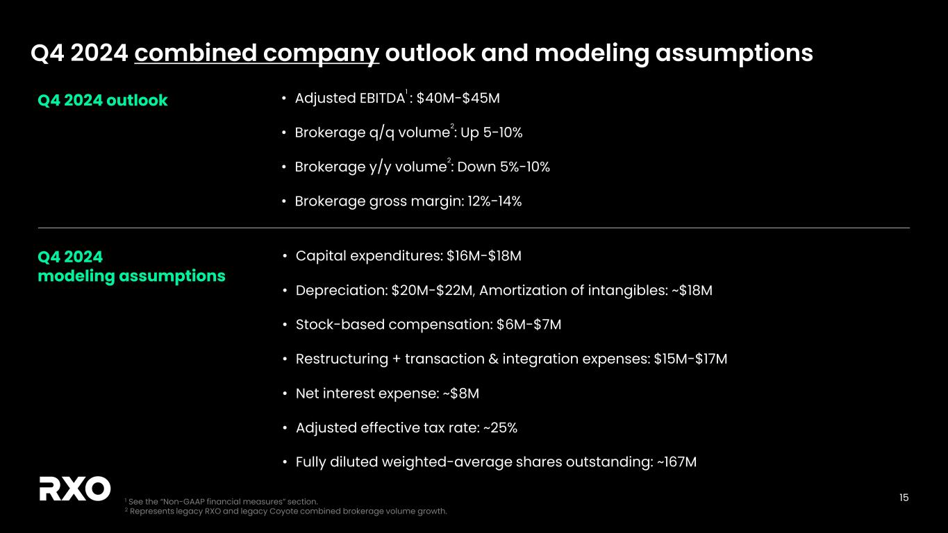14 Historical legacy RXO LTL volume and gross profit per load1 Legacy RXO LTL brokerage volume is growing quickly with stable gross profit per load 1 Q3 2024 results and prior periods refer to legacy RXO and exclude the impact of the Coyote Logistics acquisition since September 16, 2024.