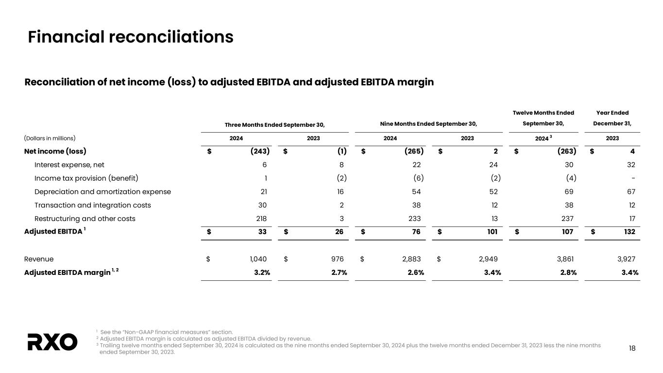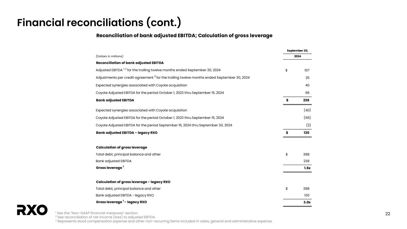 22 Financial reconciliations (cont.) 1 See the “Non-GAAP financial measures” section. 2 See reconciliation of net income (loss) to adjusted EBITDA. 3 Represents stock compensation expense and other non-recurring items included in sales, general and administrative expense. September 30, (Dollars in millions) 2024 Reconciliation of bank adjusted EBITDA   Adjusted EBITDA 1, 2 for the trailing twelve months ended September 30, 2024 107$ Adjustments per credit agreement 3 for the trailing twelve months ended September 30, 2024 25 Expected synergies associated with Coyote acquisition 40 Coyote Adjusted EBITDA for the period October 1, 2023 thru September 15, 2024 66 Bank adjusted EBITDA 238$ Expected synergies associated with Coyote acquisition (40) Coyote Adjusted EBITDA for the period October 1, 2023 thru September 15, 2024 (66) Coyote Adjusted EBITDA for the period September 16, 2024 thru September 30, 2024 (2) Bank adjusted EBITDA - legacy RXO 130$ Calculation of gross leverage Total debt, principal balance and other 388$ Bank adjusted EBITDA 238 Gross leverage 1 1.6x Calculation of gross leverage - legacy RXO Total debt, principal balance and other 388$ Bank adjusted EBITDA - legacy RXO 130 Gross leverage 1 - legacy RXO 3.0x Reconciliation of bank adjusted EBITDA; Calculation of gross leverage
