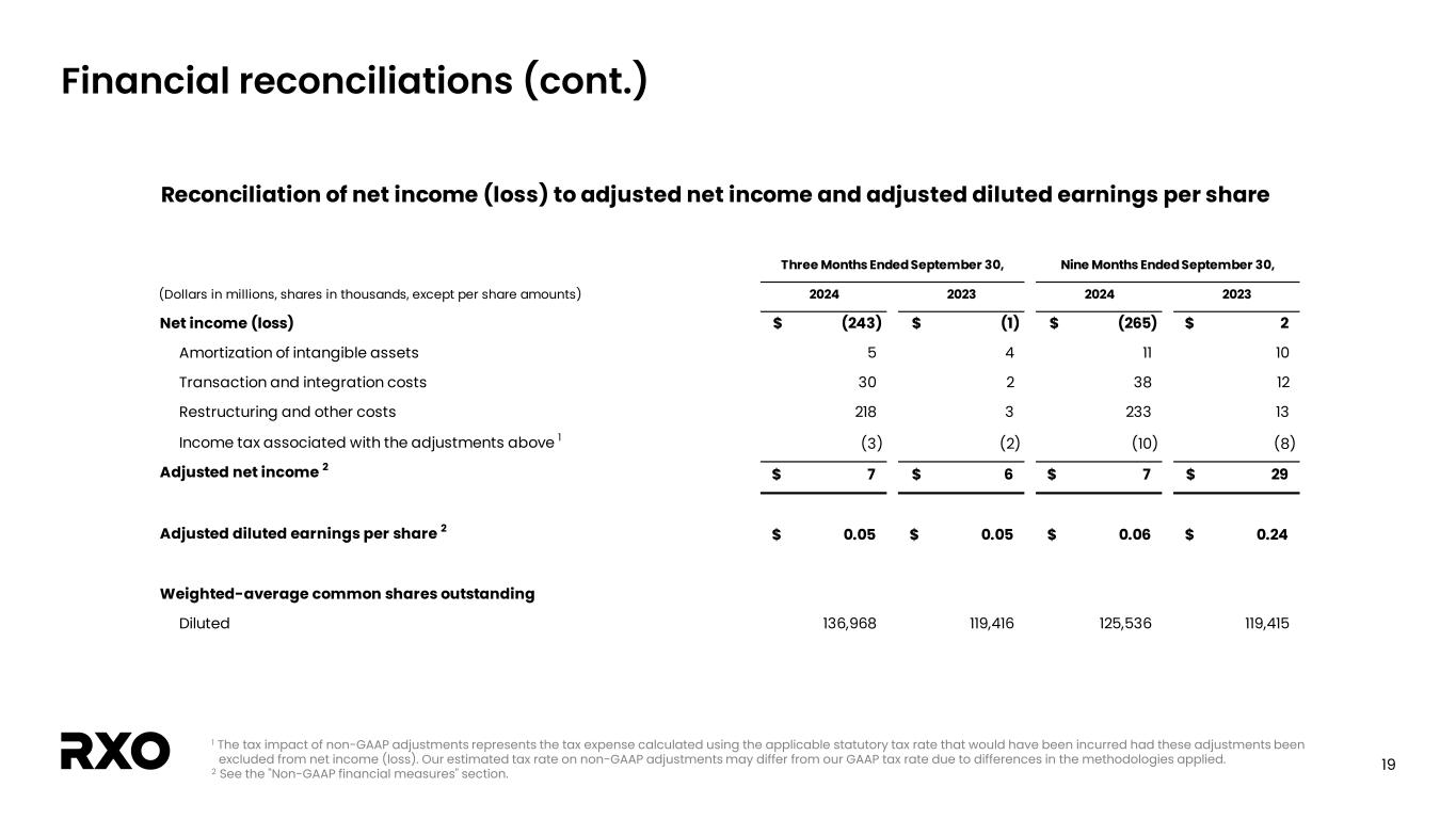 18 Financial reconciliations 1 See the “Non-GAAP financial measures” section. 2 Adjusted EBITDA margin is calculated as adjusted EBITDA divided by revenue. 3 Trailing twelve months ended September 30, 2024 is calculated as the nine months ended September 30, 2024 plus the twelve months ended December 31, 2023 less the nine months ended September 30, 2023. Reconciliation of net income (loss) to adjusted EBITDA and adjusted EBITDA margin Twelve Months Ended September 30, Year Ended December 31, (Dollars in millions) 2024 2023 2024 2023 2024 3 2023 Net income (loss) (243)$ (1)$ (265)$ 2$ (263)$ 4$ Interest expense, net 6 8 22 24 30 32 Income tax provision (benefit) 1 (2) (6) (2) (4) - Depreciation and amortization expense 21 16 54 52 69 67 Transaction and integration costs 30 2 38 12 38 12 Restructuring and other costs 218 3 233 13 237 17 Adjusted EBITDA 1 33$ 26$ 76$ 101$ 107$ 132$ Revenue 1,040$ 976$ 2,883$ 2,949$ 3,861 3,927 Adjusted EBITDA margin 1, 2 3.2% 2.7% 2.6% 3.4% 2.8% 3.4% Three Months Ended September 30, Nine Months Ended September 30,