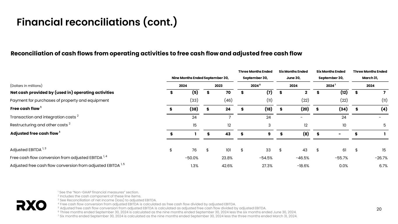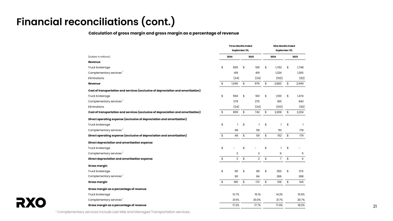 21 Financial reconciliations (cont.) 1 Complementary services include Last Mile and Managed Transportation services. Calculation of gross margin and gross margin as a percentage of revenue               (Dollars in millions)   2024   2023 2024   2023 Revenue               Truck brokerage   655$   591$ 1,762$   1,748$ Complementary services 1   419   419 1,224   1,293 Eliminations   (34)   (34) (103)   (92) Revenue   1,040$   976$ 2,883$   2,949$                 Cost of transportation and services (exclusive of depreciation and amortization)               Truck brokerage   564$   501$ 1,510$   1,474$ Complementary services 1   279   275 801   842 Eliminations   (34)   (34) (103)   (92) Cost of transportation and services (exclusive of depreciation and amortization)   809$   742$ 2,208$   2,224$                 Direct operating expense (exclusive of depreciation and amortization)               Truck brokerage   1$   1$ 1$   1$ Complementary services 1   48   58 151   178 Direct operating expense (exclusive of depreciation and amortization)   49$   59$ 152$   179$ Direct depreciation and amortization expense Truck brokerage -$ -$ 1$ -$ Complementary services 1 2 2 6 5 Direct depreciation and amortization expense   2$ 2$ 7$ 5$ Gross margin               Truck brokerage   90$ 89$ 250$ 273$ Complementary services 1   90 84 266 268 Gross margin   180$   173$ 516$   541$                 Gross margin as a percentage of revenue               Truck brokerage   13.7%   15.1% 14.2%   15.6% Complementary services 1   21.5%   20.0% 21.7%   20.7% Gross margin as a percentage of revenue   17.3%   17.7% 17.9%   18.3% Three Months Ended September 30, Nine Months Ended September 30,