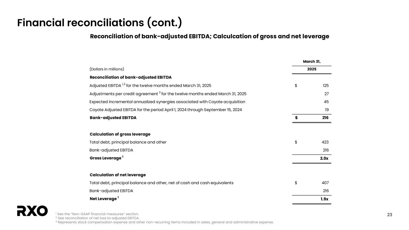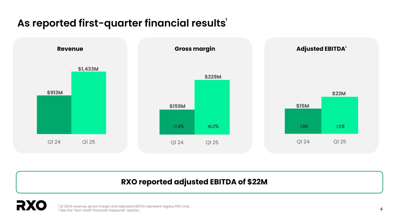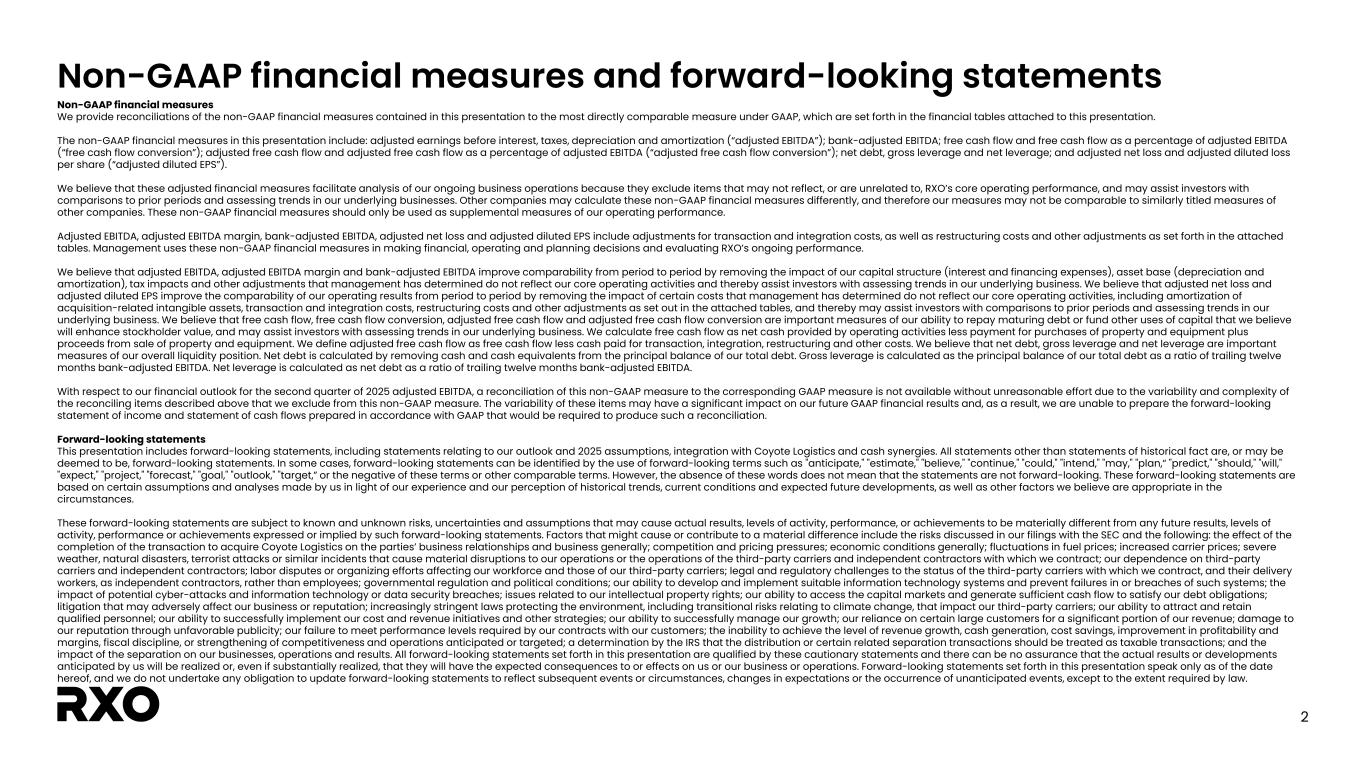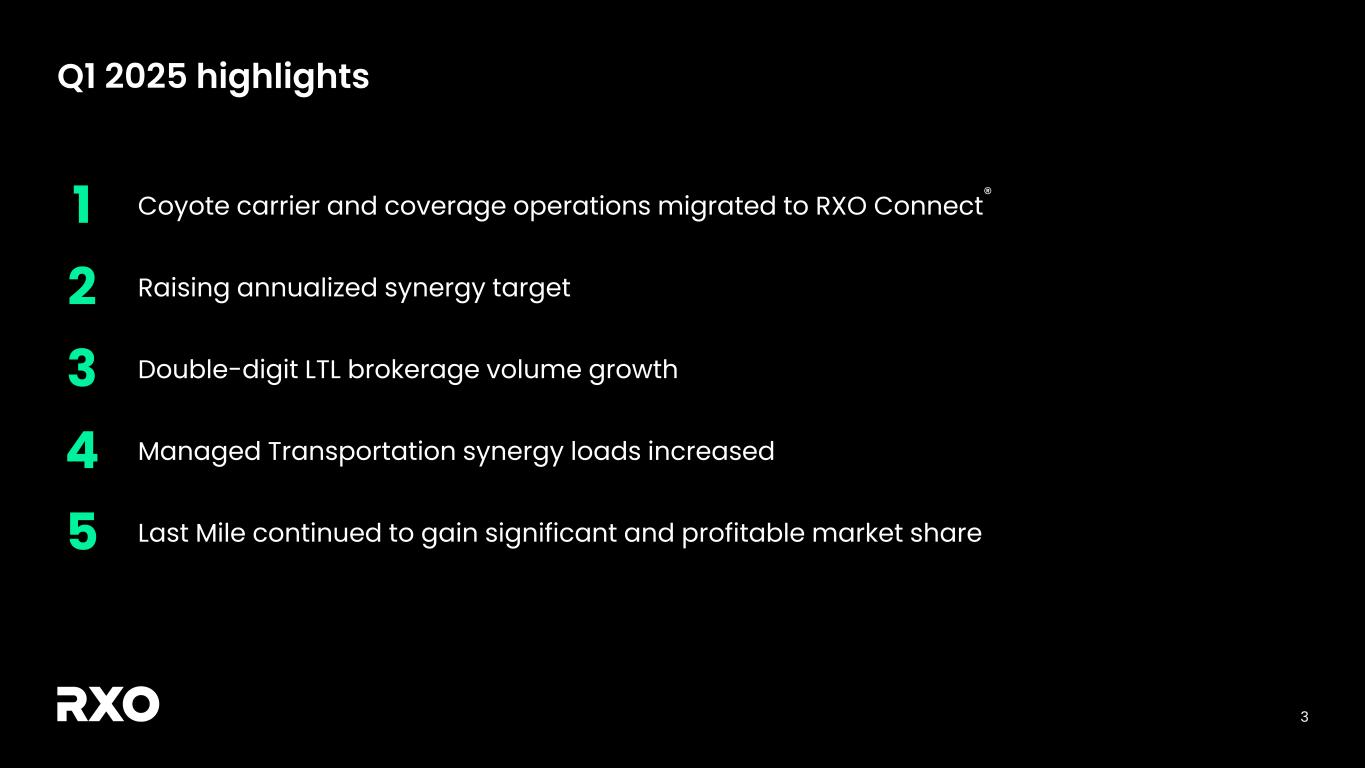 2 Non-GAAP financial measures and forward-looking statements Non-GAAP financial measures We provide reconciliations of the non-GAAP financial measures contained in this presentation to the most directly comparable measure under GAAP, which are set forth in the financial tables attached to this presentation. The non-GAAP financial measures in this presentation include: adjusted earnings before interest, taxes, depreciation and amortization (“adjusted EBITDA”); bank-adjusted EBITDA; free cash flow and free cash flow as a percentage of adjusted EBITDA (“free cash flow conversion”); adjusted free cash flow and adjusted free cash flow as a percentage of adjusted EBITDA (“adjusted free cash flow conversion”); net debt, gross leverage and net leverage; and adjusted net loss and adjusted diluted loss per share (“adjusted diluted EPS”). We believe that these adjusted financial measures facilitate analysis of our ongoing business operations because they exclude items that may not reflect, or are unrelated to, RXO’s core operating performance, and may assist investors with comparisons to prior periods and assessing trends in our underlying businesses. Other companies may calculate these non-GAAP financial measures differently, and therefore our measures may not be comparable to similarly titled measures of other companies. These non-GAAP financial measures should only be used as supplemental measures of our operating performance. Adjusted EBITDA, adjusted EBITDA margin, bank-adjusted EBITDA, adjusted net loss and adjusted diluted EPS include adjustments for transaction and integration costs, as well as restructuring costs and other adjustments as set forth in the attached tables. Management uses these non-GAAP financial measures in making financial, operating and planning decisions and evaluating RXO’s ongoing performance. We believe that adjusted EBITDA, adjusted EBITDA margin and bank-adjusted EBITDA improve comparability from period to period by removing the impact of our capital structure (interest and financing expenses), asset base (depreciation and amortization), tax impacts and other adjustments that management has determined do not reflect our core operating activities and thereby assist investors with assessing trends in our underlying business. We believe that adjusted net loss and adjusted diluted EPS improve the comparability of our operating results from period to period by removing the impact of certain costs that management has determined do not reflect our core operating activities, including amortization of acquisition-related intangible assets, transaction and integration costs, restructuring costs and other adjustments as set out in the attached tables, and thereby may assist investors with comparisons to prior periods and assessing trends in our underlying business. We believe that free cash flow, free cash flow conversion, adjusted free cash flow and adjusted free cash flow conversion are important measures of our ability to repay maturing debt or fund other uses of capital that we believe will enhance stockholder value, and may assist investors with assessing trends in our underlying business. We calculate free cash flow as net cash provided by operating activities less payment for purchases of property and equipment plus proceeds from sale of property and equipment. We define adjusted free cash flow as free cash flow less cash paid for transaction, integration, restructuring and other costs. We believe that net debt, gross leverage and net leverage are important measures of our overall liquidity position. Net debt is calculated by removing cash and cash equivalents from the principal balance of our total debt. Gross leverage is calculated as the principal balance of our total debt as a ratio of trailing twelve months bank-adjusted EBITDA. Net leverage is calculated as net debt as a ratio of trailing twelve months bank-adjusted EBITDA. With respect to our financial outlook for the second quarter of 2025 adjusted EBITDA, a reconciliation of this non-GAAP measure to the corresponding GAAP measure is not available without unreasonable effort due to the variability and complexity of the reconciling items described above that we exclude from this non-GAAP measure. The variability of these items may have a significant impact on our future GAAP financial results and, as a result, we are unable to prepare the forward-looking statement of income and statement of cash flows prepared in accordance with GAAP that would be required to produce such a reconciliation. Forward-looking statements This presentation includes forward-looking statements, including statements relating to our outlook and 2025 assumptions, integration with Coyote Logistics and cash synergies. All statements other than statements of historical fact are, or may be deemed to be, forward-looking statements. In some cases, forward-looking statements can be identified by the use of forward-looking terms such as "anticipate," "estimate," "believe," "continue," "could," "intend," "may," "plan,“ "predict," "should," "will," "expect," "project," "forecast," "goal," "outlook," "target,” or the negative of these terms or other comparable terms. However, the absence of these words does not mean that the statements are not forward-looking. These forward-looking statements are based on certain assumptions and analyses made by us in light of our experience and our perception of historical trends, current conditions and expected future developments, as well as other factors we believe are appropriate in the circumstances. These forward-looking statements are subject to known and unknown risks, uncertainties and assumptions that may cause actual results, levels of activity, performance, or achievements to be materially different from any future results, levels of activity, performance or achievements expressed or implied by such forward-looking statements. Factors that might cause or contribute to a material di