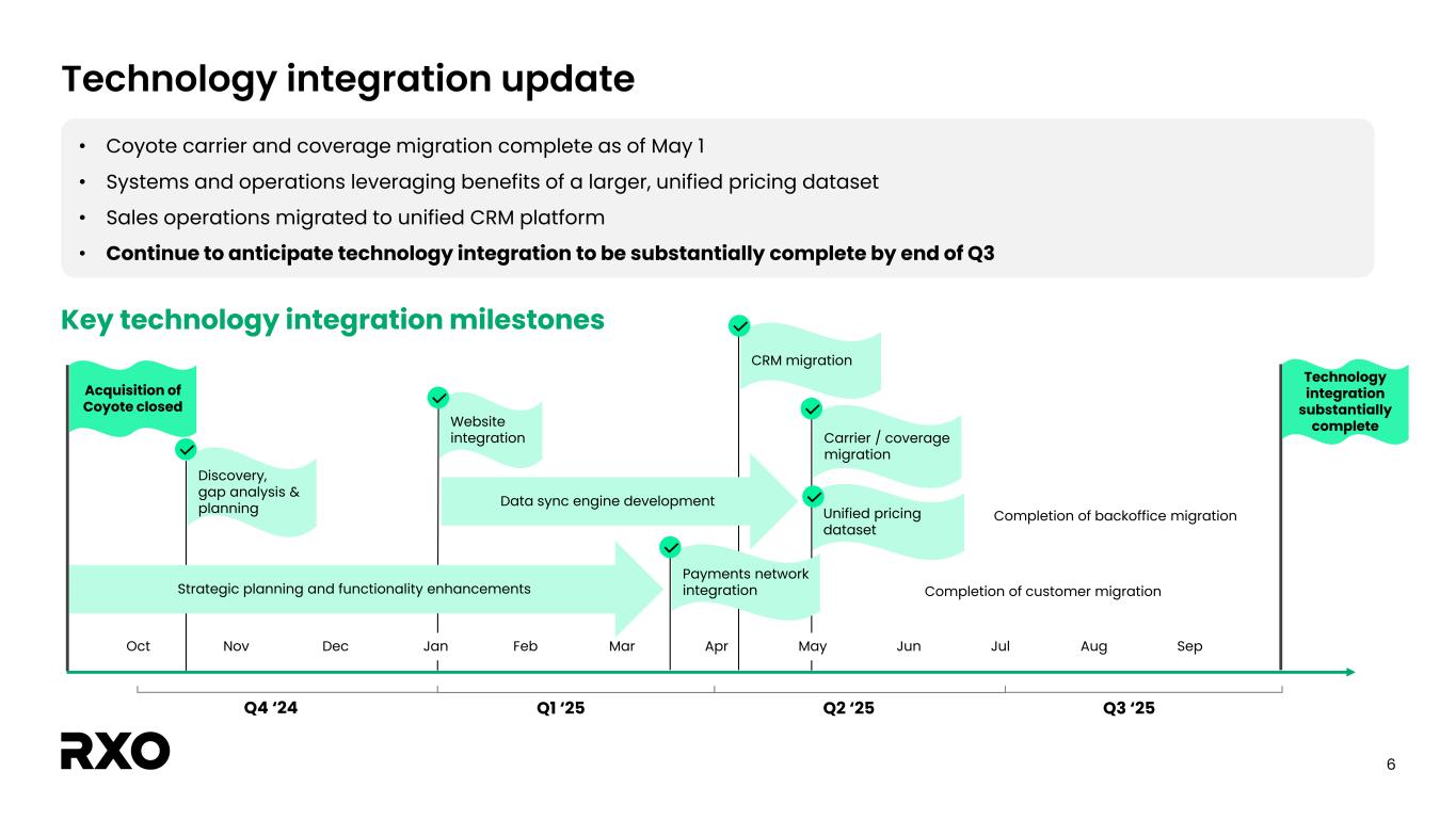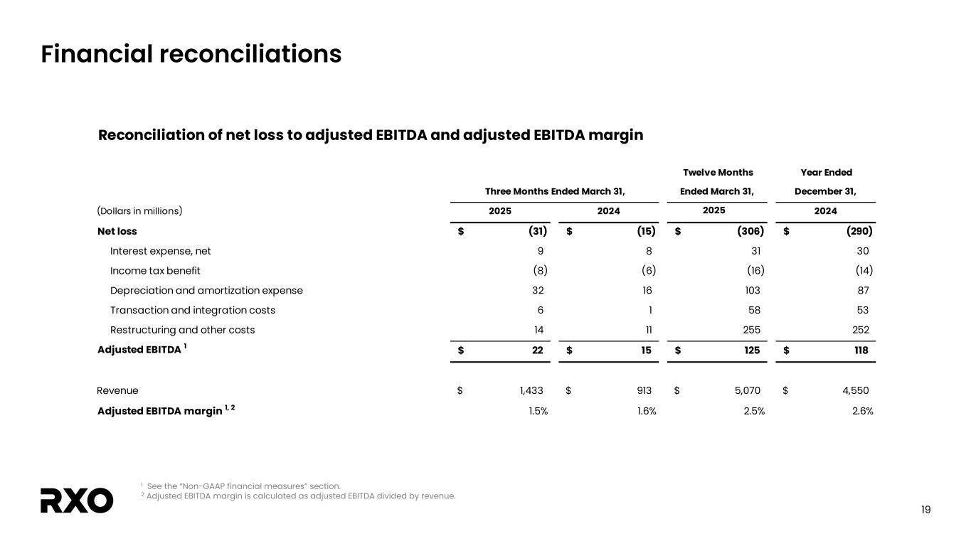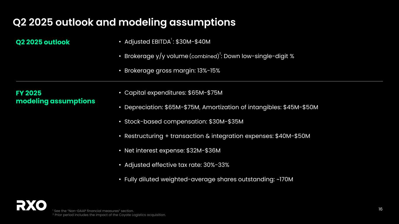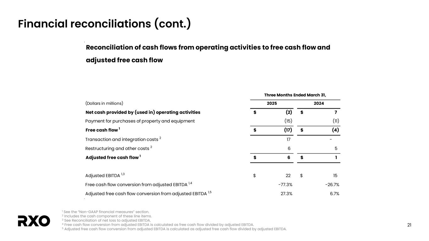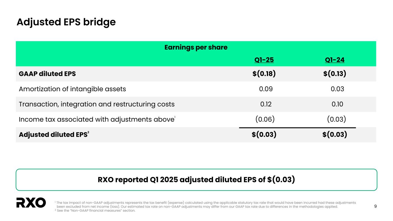 2 Non-GAAP financial measures and forward-looking statements Non-GAAP financial measures We provide reconciliations of the non-GAAP financial measures contained in this presentation to the most directly comparable measure under GAAP, which are set forth in the financial tables attached to this presentation. The non-GAAP financial measures in this presentation include: adjusted earnings before interest, taxes, depreciation and amortization (“adjusted EBITDA”); bank-adjusted EBITDA; free cash flow and free cash flow as a percentage of adjusted EBITDA (“free cash flow conversion”); adjusted free cash flow and adjusted free cash flow as a percentage of adjusted EBITDA (“adjusted free cash flow conversion”); net debt, gross leverage and net leverage; and adjusted net loss and adjusted diluted loss per share (“adjusted diluted EPS”). We believe that these adjusted financial measures facilitate analysis of our ongoing business operations because they exclude items that may not reflect, or are unrelated to, RXO’s core operating performance, and may assist investors with comparisons to prior periods and assessing trends in our underlying businesses. Other companies may calculate these non-GAAP financial measures differently, and therefore our measures may not be comparable to similarly titled measures of other companies. These non-GAAP financial measures should only be used as supplemental measures of our operating performance. Adjusted EBITDA, adjusted EBITDA margin, bank-adjusted EBITDA, adjusted net loss and adjusted diluted EPS include adjustments for transaction and integration costs, as well as restructuring costs and other adjustments as set forth in the attached tables. Management uses these non-GAAP financial measures in making financial, operating and planning decisions and evaluating RXO’s ongoing performance. We believe that adjusted EBITDA, adjusted EBITDA margin and bank-adjusted EBITDA improve comparability from period to period by removing the impact of our capital structure (interest and financing expenses), asset base (depreciation and amortization), tax impacts and other adjustments that management has determined do not reflect our core operating activities and thereby assist investors with assessing trends in our underlying business. We believe that adjusted net loss and adjusted diluted EPS improve the comparability of our operating results from period to period by removing the impact of certain costs that management has determined do not reflect our core operating activities, including amortization of acquisition-related intangible assets, transaction and integration costs, restructuring costs and other adjustments as set out in the attached tables, and thereby may assist investors with comparisons to prior periods and assessing trends in our underlying business. We believe that free cash flow, free cash flow conversion, adjusted free cash flow and adjusted free cash flow conversion are important measures of our ability to repay maturing debt or fund other uses of capital that we believe will enhance stockholder value, and may assist investors with assessing trends in our underlying business. We calculate free cash flow as net cash provided by operating activities less payment for purchases of property and equipment plus proceeds from sale of property and equipment. We define adjusted free cash flow as free cash flow less cash paid for transaction, integration, restructuring and other costs. We believe that net debt, gross leverage and net leverage are important measures of our overall liquidity position. Net debt is calculated by removing cash and cash equivalents from the principal balance of our total debt. Gross leverage is calculated as the principal balance of our total debt as a ratio of trailing twelve months bank-adjusted EBITDA. Net leverage is calculated as net debt as a ratio of trailing twelve months bank-adjusted EBITDA. With respect to our financial outlook for the second quarter of 2025 adjusted EBITDA, a reconciliation of this non-GAAP measure to the corresponding GAAP measure is not available without unreasonable effort due to the variability and complexity of the reconciling items described above that we exclude from this non-GAAP measure. The variability of these items may have a significant impact on our future GAAP financial results and, as a result, we are unable to prepare the forward-looking statement of income and statement of cash flows prepared in accordance with GAAP that would be required to produce such a reconciliation. Forward-looking statements This presentation includes forward-looking statements, including statements relating to our outlook and 2025 assumptions, integration with Coyote Logistics and cash synergies. All statements other than statements of historical fact are, or may be deemed to be, forward-looking statements. In some cases, forward-looking statements can be identified by the use of forward-looking terms such as "anticipate," "estimate," "believe," "continue," "could," "intend," "may," "plan,“ "predict," "should," "will," "expect," "project," "forecast," "goal," "outlook," "target,” or the negative of these terms or other comparable terms. However, the absence of these words does not mean that the statements are not forward-looking. These forward-looking statements are based on certain assumptions and analyses made by us in light of our experience and our perception of historical trends, current conditions and expected future developments, as well as other factors we believe are appropriate in the circumstances. These forward-looking statements are subject to known and unknown risks, uncertainties and assumptions that may cause actual results, levels of activity, performance, or achievements to be materially different from any future results, levels of activity, performance or achievements expressed or implied by such forward-looking statements. Factors that might cause or contribute to a material di