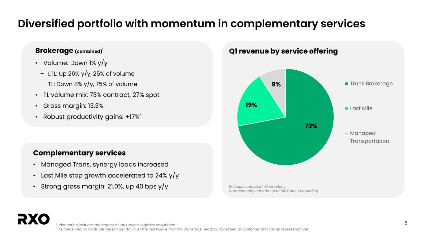 4 $159M $229M Q1 24 Q1 25 As reported first-quarter financial results RXO reported adjusted EBITDA of $22M Adjusted EBITDA2Gross margin 1 Q1 2024 revenue, gross margin and adjusted EBITDA represent legacy RXO only. 2 See the “Non-GAAP financial measures” section. $15M $22M Q1 24 Q1 25 1.6% 1.5%17.4% Revenue $913M $1,433M Q1 24 Q1 25 16.0% 1