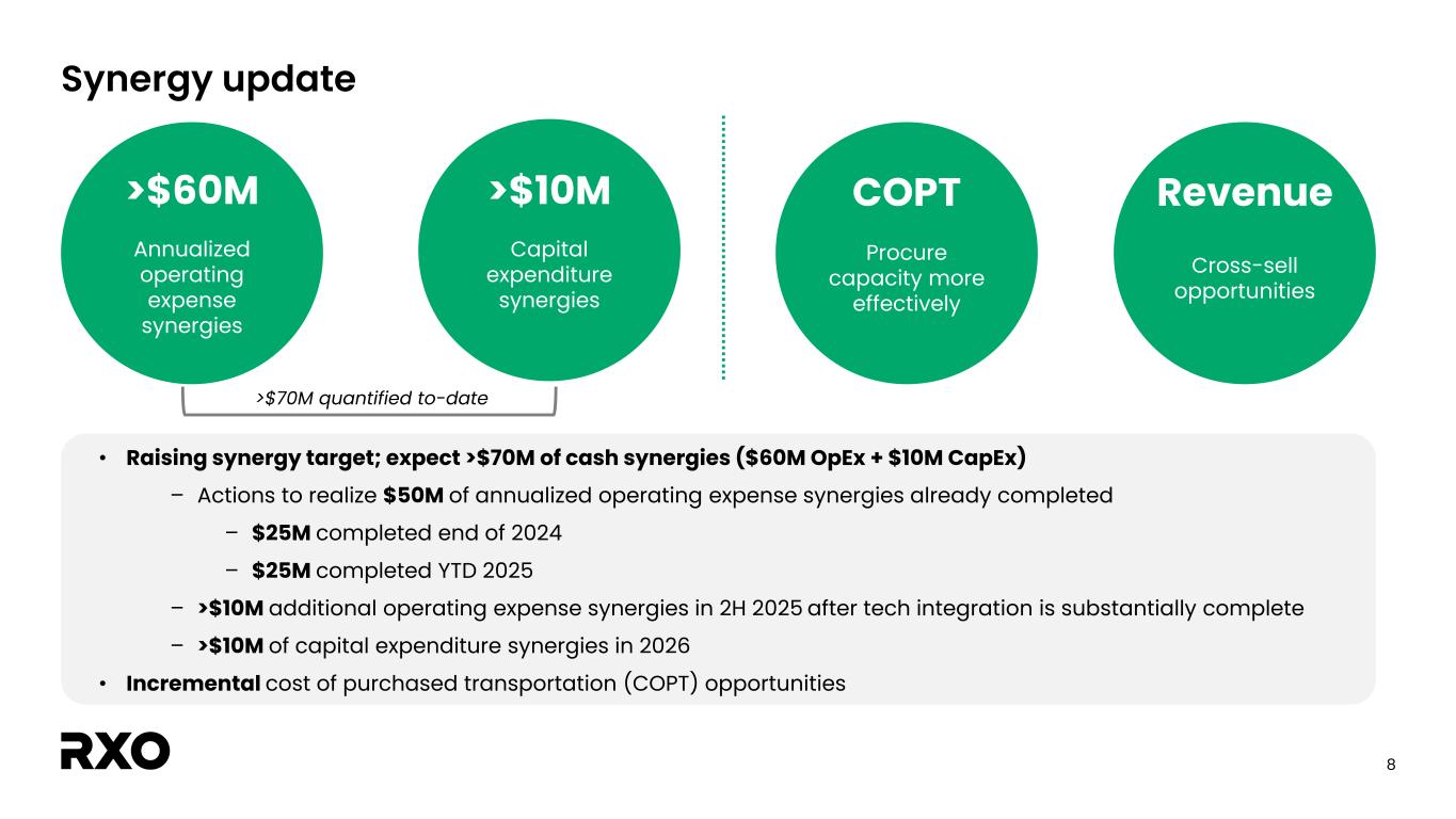 7 Carrier and coverage migration: Complete Migration to RXO platform complete • Migration completed on May 1 • Increased capacity and availability across network • Improved ability to buy transportation more effectively and better serve customers • Carriers in one system to access all available loads • Accelerated synergy opportunities associated with sunsetting legacy Coyote coverage applications Successful migration enables significant COPT savings opportunities Bazooka Freight Optimizer (RXO Connect ®)Data sync Legacy Coyote load creation Legacy RXO load creation RXO Drive RXO Connect® for carriers Data migration Unified load coverage