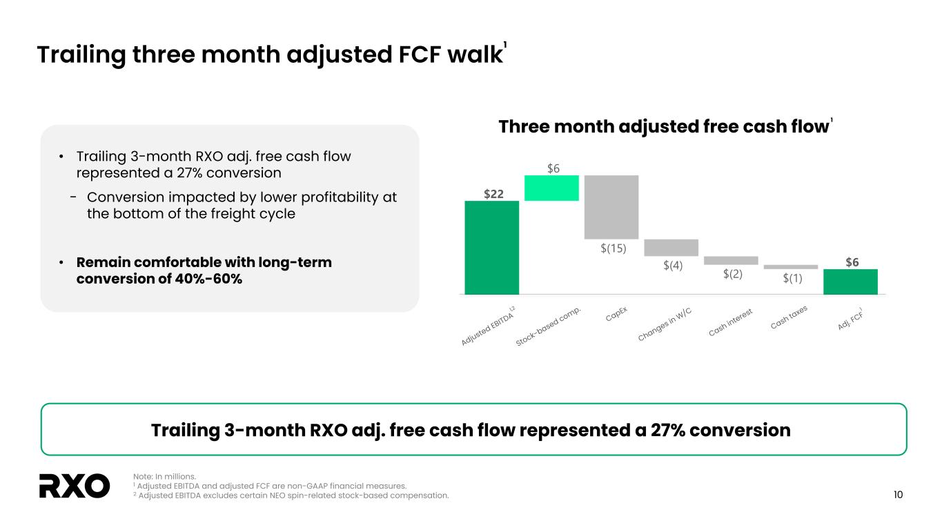 9 Adjusted EPS bridge Earnings per share Q1-25 Q1-24 GAAP diluted EPS $(0.18) $(0.13) Amortization of intangible assets 0.09 0.03 Transaction, integration and restructuring costs 0.12 0.10 Income tax associated with adjustments above1 (0.06) (0.03) Adjusted diluted EPS2 $(0.03) $(0.03) RXO reported Q1 2025 adjusted diluted EPS of $(0.03) 1 The tax impact of non-GAAP adjustments represents the tax benefit (expense) calculated using the applicable statutory tax rate that would have been incurred had these adjustments been excluded from net income (loss). Our estimated tax rate on non-GAAP adjustments may differ from our GAAP tax rate due to differences in the methodologies applied. 2 See the “Non-GAAP financial measures” section.
