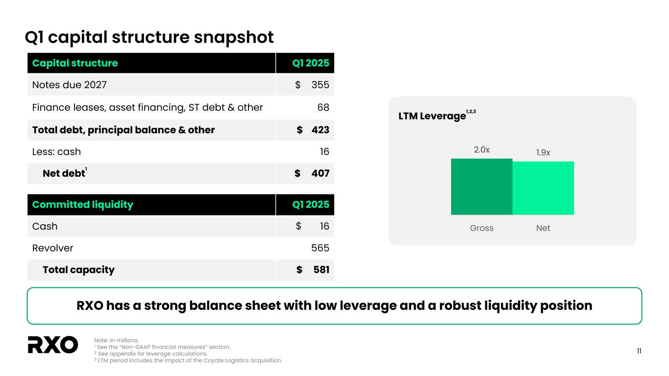 10 Trailing three month adjusted FCF walk Note: In millions. 1 Adjusted EBITDA and adjusted FCF are non-GAAP financial measures. 2 Adjusted EBITDA excludes certain NEO spin-related stock-based compensation. Trailing 3-month RXO adj. free cash flow represented a 27% conversion Three month adjusted free cash flow1 1 • Trailing 3-month RXO adj. free cash flow represented a 27% conversion − Conversion impacted by lower profitability at the bottom of the freight cycle • Remain comfortable with long-term conversion of 40%-60%