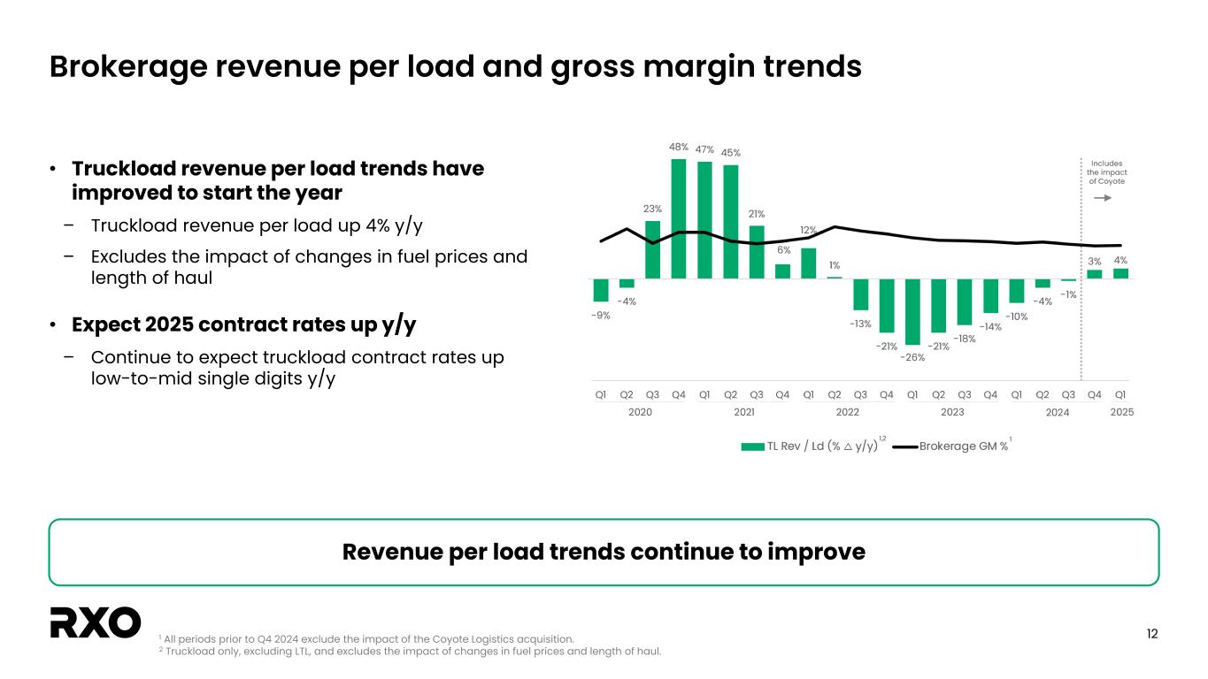 11 Q1 capital structure snapshot Capital structure Q1 2025 Notes due 2027 $ 355 Finance leases, asset financing, ST debt & other 68 Total debt, principal balance & other $ 423 Less: cash 16 Net debt1 $ 407 Committed liquidity Q1 2025 Cash $ 16 Revolver 565 Total capacity $ 581 Note: In millions. 1 See the “Non-GAAP financial measures” section. 2 See appendix for leverage calculations. 3 LTM period includes the impact of the Coyote Logistics acquisition. LTM Leverage1,2,3 2.0x 1.9x Gross Net RXO has a strong balance sheet with low leverage and a robust liquidity position