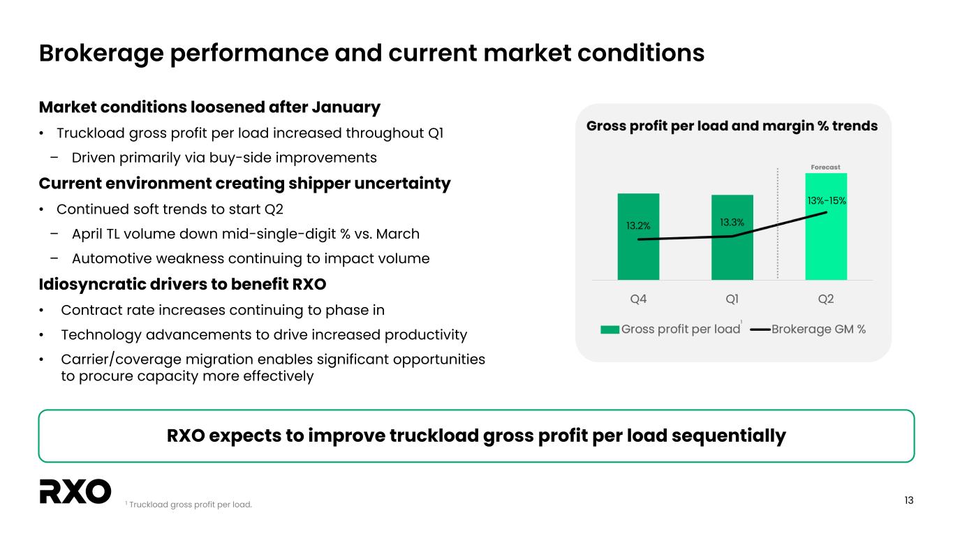 12 Brokerage revenue per load and gross margin trends Revenue per load trends continue to improve • Truckload revenue per load trends have improved to start the year – Truckload revenue per load up 4% y/y – Excludes the impact of changes in fuel prices and length of haul • Expect 2025 contract rates up y/y – Continue to expect truckload contract rates up low-to-mid single digits y/y 1 All periods prior to Q4 2024 exclude the impact of the Coyote Logistics acquisition. 2 Truckload only, excluding LTL, and excludes the impact of changes in fuel prices and length of haul.