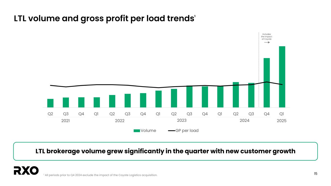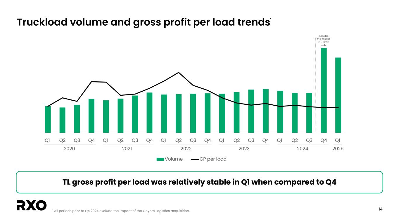 14 Truckload volume and gross profit per load trends1 1 All periods prior to Q4 2024 exclude the impact of the Coyote Logistics acquisition. TL gross profit per load was relatively stable in Q1 when compared to Q4