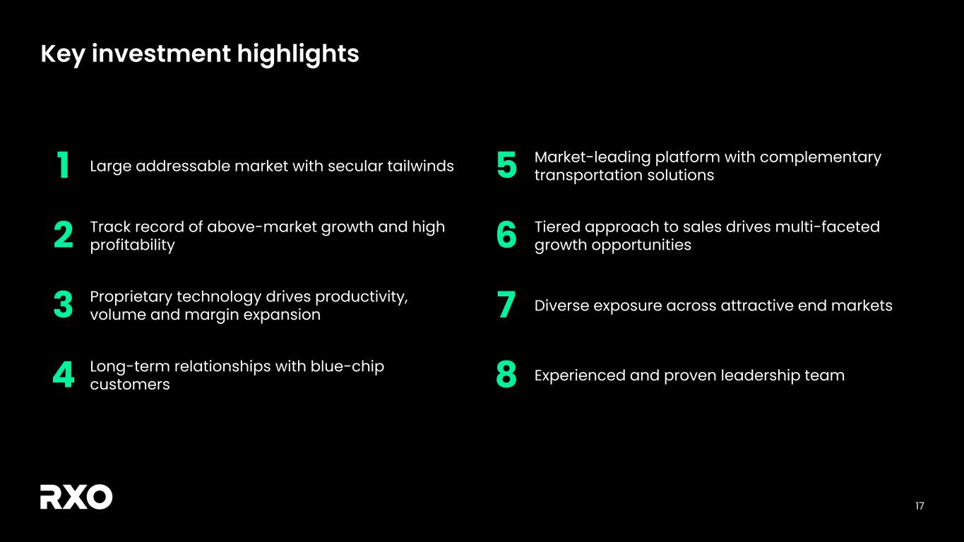 16 Q2 2025 outlook and modeling assumptions • Adjusted EBITDA1 : $30M-$40M • Brokerage y/y volume (combined) 2: Down low-single-digit % • Brokerage gross margin: 13%-15% Q2 2025 outlook FY 2025 modeling assumptions • Capital expenditures: $65M-$75M • Depreciation: $65M-$75M, Amortization of intangibles: $45M-$50M • Stock-based compensation: $30M-$35M • Restructuring + transaction & integration expenses: $40M-$50M • Net interest expense: $32M-$36M • Adjusted effective tax rate: 30%-33% • Fully diluted weighted-average shares outstanding: ~170M 1 See the “Non-GAAP financial measures” section. 2 Prior period includes the impact of the Coyote Logistics acquisition.