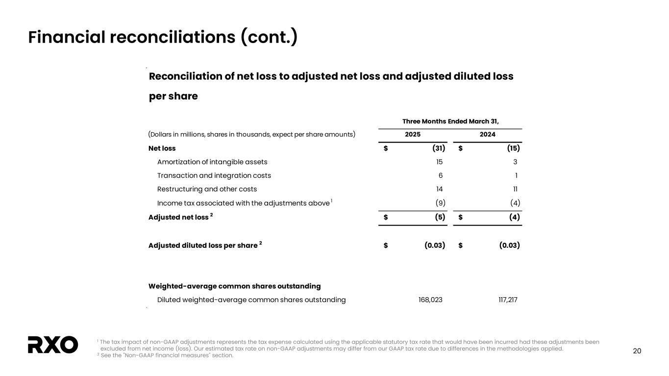 20 Financial reconciliations (cont.) 1 The tax impact of non-GAAP adjustments represents the tax expense calculated using the applicable statutory tax rate that would have been incurred had these adjustments been excluded from net income (loss). Our estimated tax rate on non-GAAP adjustments may differ from our GAAP tax rate due to differences in the methodologies applied. 2 See the "Non-GAAP financial measures" section. (Dollars in millions, shares in thousands, expect per share amounts) 2025 2024 Net loss (31)$ (15)$ Amortization of intangible assets 15 3 Transaction and integration costs 6 1 Restructuring and other costs 14 11 Income tax associated with the adjustments above 1 (9) (4) Adjusted net loss 2 (5)$ (4)$ Adjusted diluted loss per share 2 (0.03)$ (0.03)$ Weighted-average common shares outstanding Diluted weighted-average common shares outstanding 168,023 117,217 Three Months Ended March 31, Reconciliation of net loss to adjusted net loss and adjusted diluted loss per share