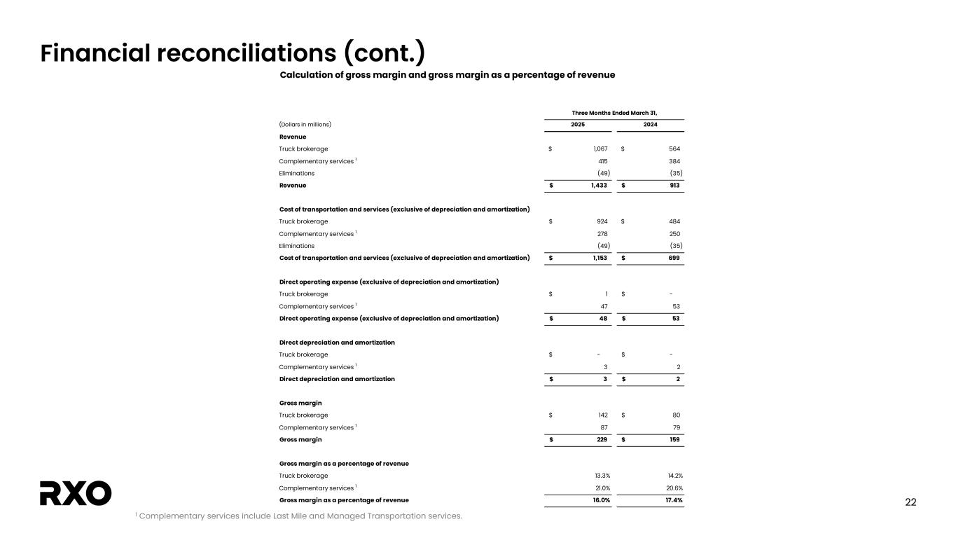 22 Financial reconciliations (cont.) 1 Complementary services include Last Mile and Managed Transportation services. Calculation of gross margin and gross margin as a percentage of revenue (Dollars in millions) 2025 2024 Revenue Truck brokerage 1,067$ 564$ Complementary services 1 415 384 Eliminations (49) (35) Revenue 1,433$ 913$ Cost of transportation and services (exclusive of depreciation and amortization) Truck brokerage 924$ 484$ Complementary services 1 278 250 Eliminations (49) (35) Cost of transportation and services (exclusive of depreciation and amortization) 1,153$ 699$ Direct operating expense (exclusive of depreciation and amortization) Truck brokerage 1$ -$ Complementary services 1 47 53 Direct operating expense (exclusive of depreciation and amortization) 48$ 53$ Direct depreciation and amortization Truck brokerage -$ -$ Complementary services 1 3 2 Direct depreciation and amortization 3$ 2$ Gross margin Truck brokerage 142$ 80$ Complementary services 1 87 79 Gross margin 229$ 159$ Gross margin as a percentage of revenue Truck brokerage 13.3% 14.2% Complementary services 1 21.0% 20.6% Gross margin as a percentage of revenue 16.0% 17.4% Three Months Ended March 31,