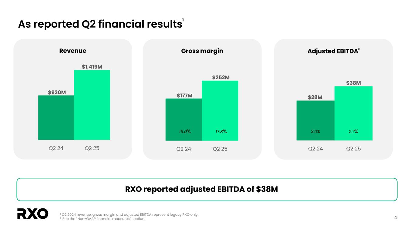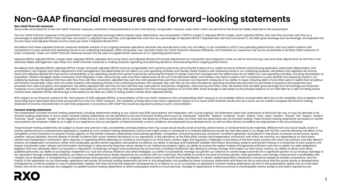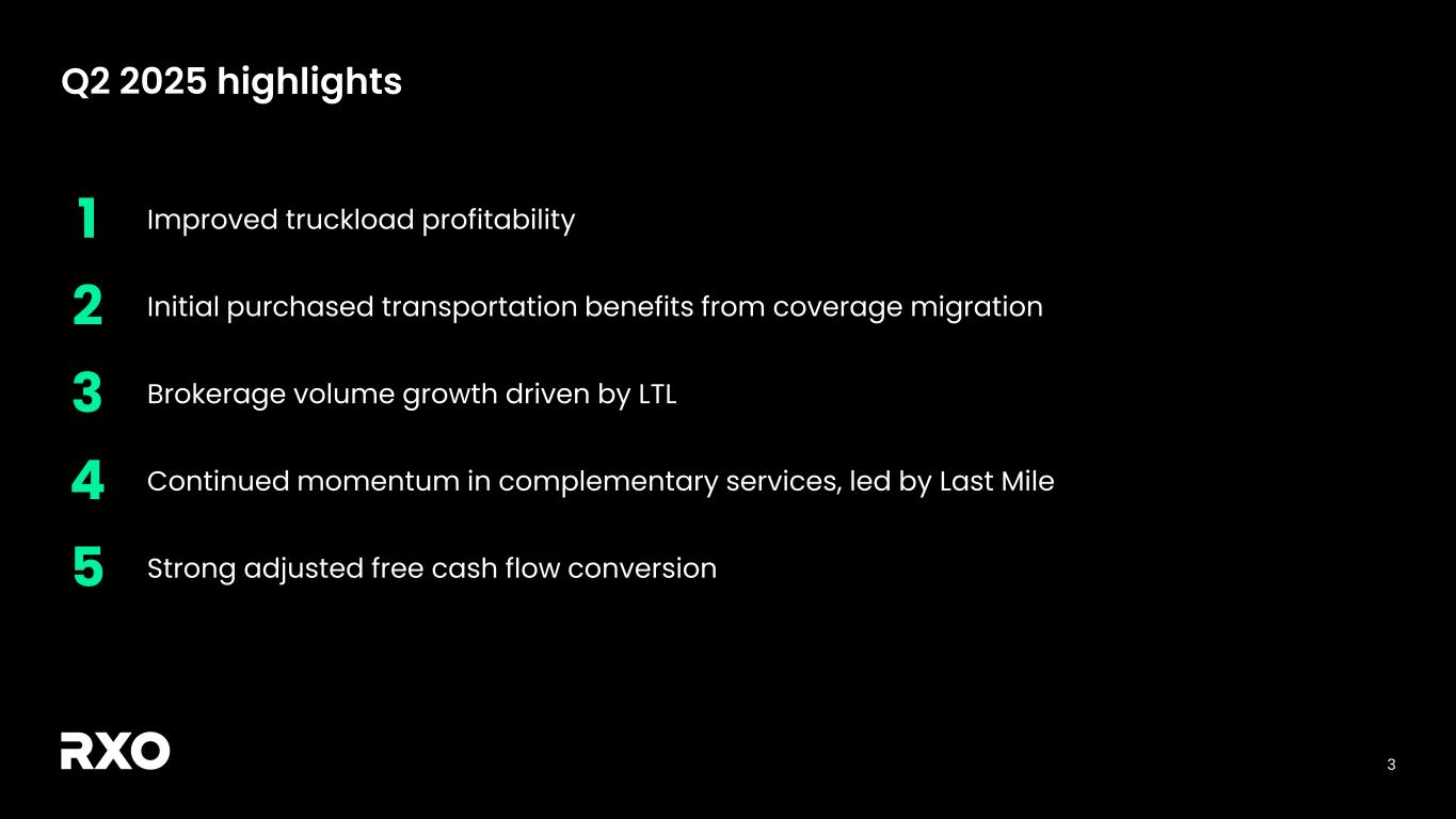 2 Non-GAAP financial measures and forward-looking statements Non-GAAP financial measures We provide reconciliations of the non-GAAP financial measures contained in this presentation to the most directly comparable measure under GAAP, which are set forth in the financial tables attached to this presentation. The non-GAAP financial measures in this presentation include: adjusted earnings before interest, taxes, depreciation and amortization (“EBITDA margin”); adjusted EBITDA margin; bank-adjusted EBITDA; free cash flow and free cash flow as a percentage of adjusted EBITDA (“free cash flow conversion”); adjusted free cash flow and adjusted free cash flow as a percentage of adjusted EBITDA (“adjusted free cash flow conversion”); net debt, gross leverage and net leverage; and adjusted net income (loss) and adjusted diluted income (loss) per share (“adjusted diluted EPS”). We believe that these adjusted financial measures facilitate analysis of our ongoing business operations because they exclude items that may not reflect, or are unrelated to, RXO’s core operating performance, and may assist investors with comparisons to prior periods and assessing trends in our underlying businesses. Other companies may calculate these non-GAAP financial measures differently, and therefore our measures may not be comparable to similarly titled measures of other companies. These non-GAAP financial measures should only be used as supplemental measures of our operating performance. Adjusted EBITDA, adjusted EBITDA margin, bank-adjusted EBITDA, adjusted net income (loss) and adjusted diluted EPS include adjustments for transaction and integration costs, as well as restructuring costs and other adjustments as set forth in the attached tables. Management uses these non-GAAP financial measures in making financial, operating and planning decisions and evaluating RXO’s ongoing performance. We believe that adjusted EBITDA, adjusted EBITDA margin and bank-adjusted EBITDA improve comparability from period to period by removing the impact of our capital structure (interest and financing expenses), asset base (depreciation and amortization), tax impacts and other adjustments that management has determined do not reflect our core operating activities and thereby assist investors with assessing trends in our underlying business. We believe that adjusted net income (loss) and adjusted diluted EPS improve the comparability of our operating results from period to period by removing the impact of certain costs that management has determined do not reflect our core operating activities, including amortization of acquisition-related intangible assets, transaction and integration costs, restructuring costs and other adjustments as set out in the attached tables, and thereby may assist investors with comparisons to prior periods and assessing trends in our underlying business. We believe that free cash flow, free cash flow conversion, adjusted free cash flow and adjusted free cash flow conversion are important measures of our ability to repay maturing debt or fund other uses of capital that we believe will enhance stockholder value, and may assist investors with assessing trends in our underlying business. We calculate free cash flow as net cash provided by operating activities less payment for purchases of property and equipment plus proceeds from sale of property and equipment. We define adjusted free cash flow as free cash flow less cash paid for transaction, integration, restructuring and other costs. We believe that net debt, gross leverage and net leverage are important measures of our overall liquidity position. Net debt is calculated by removing cash and cash equivalents from the principal balance of our total debt. Gross leverage is calculated as the principal balance of our total debt as a ratio of trailing twelve months bank-adjusted EBITDA. Net leverage is calculated as net debt as a ratio of trailing twelve months bank-adjusted EBITDA. With respect to our financial outlook for the third quarter of 2025 adjusted EBITDA, a reconciliation of this non-GAAP measure to the corresponding GAAP measure is not available without unreasonable effort due to the variability and complexity of the reconciling items described above that we exclude from this non-GAAP measure. The variability of these items may have a significant impact on our future GAAP financial results and, as a result, we are unable to prepare the forward-looking statement of income and statement of cash flows prepared in accordance with GAAP that would be required to produce such a reconciliation. Forward-looking statements This presentation includes forward-looking statements, including statements relating to our outlook and 2025 assumptions and integration with Coyote Logistics. All statements other than statements of historical fact are, or may be deemed to be, forward-looking statements. In some cases, forward-looking statements can be identified by the use of forward-looking terms such as "anticipate," "estimate," "believe," "continue," "could," "intend," "may," "plan,“ "predict," "should," "will," "expect," "project," "forecast," "goal," "outlook," "target,” or the negative of these terms or other comparable terms. However, the absence of these words does not mean that the statements are not forward-looking. These forward-looking statements are based on certain assumptions and analyses made by us in light of our experience and our perception of historical trends, current conditions and expected future developments, as well as other factors we believe are appropriate in the circumstances. These forward-looking statements are subject to known and unknown risks, uncertainties and assumptions that may cause actual results, levels of activity, performance, or achievements to be materially different from any future results, levels of activity, performance or achievements expressed or implied by such forward-looking statements. Factors that m