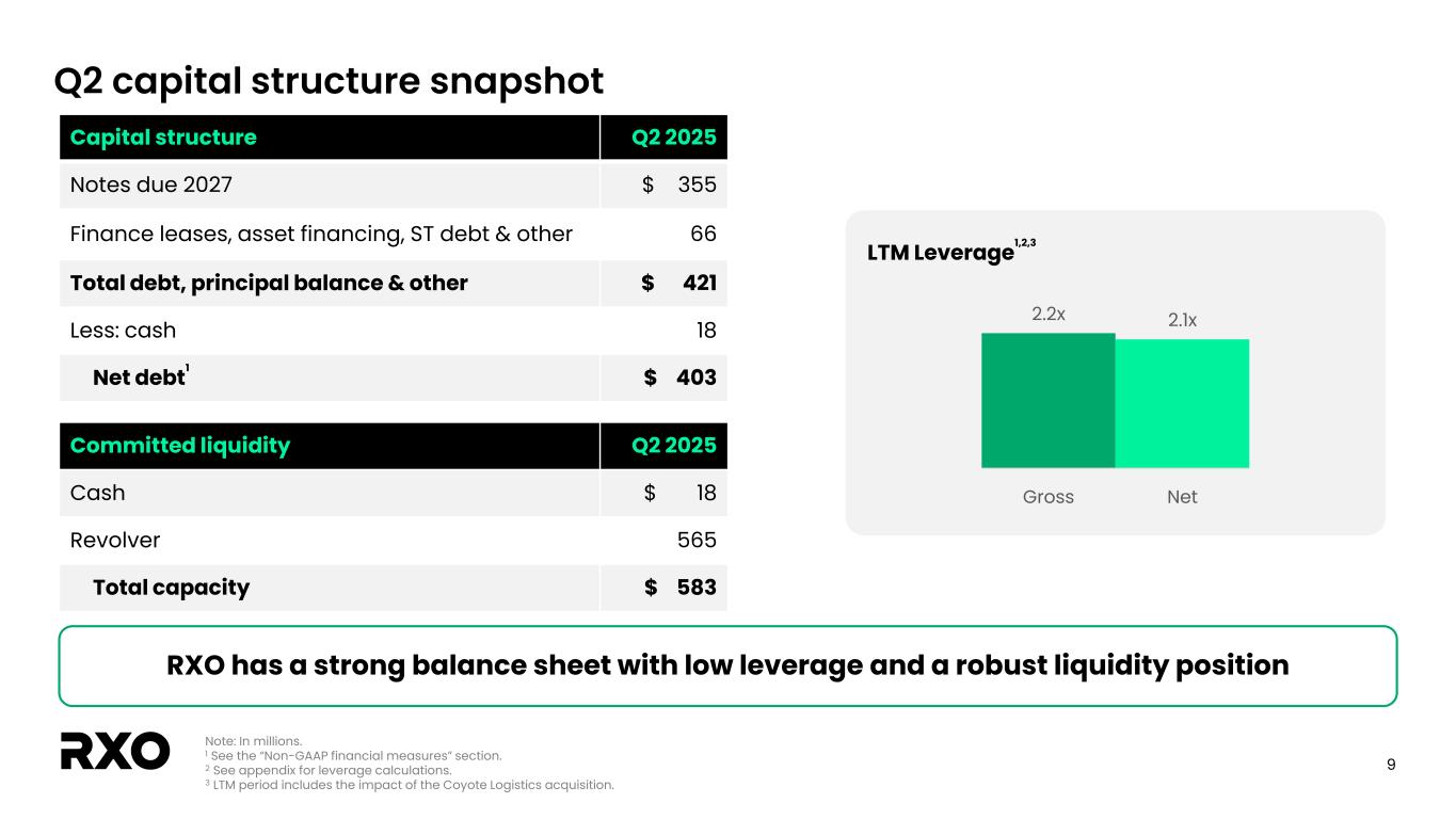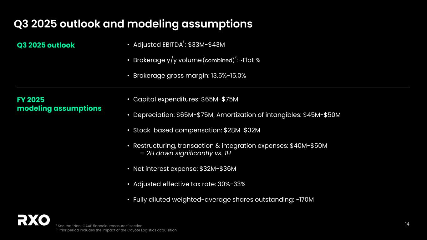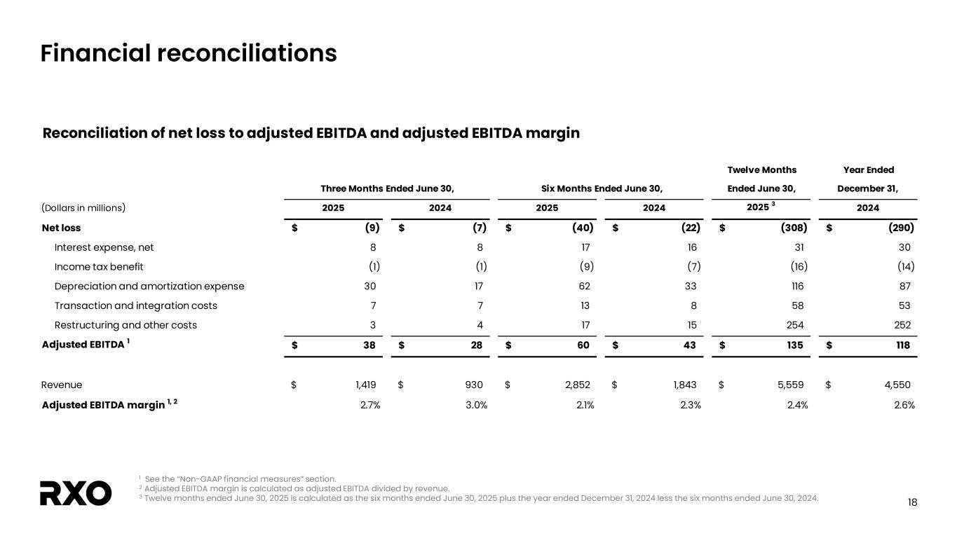 2 Non-GAAP financial measures and forward-looking statements Non-GAAP financial measures We provide reconciliations of the non-GAAP financial measures contained in this presentation to the most directly comparable measure under GAAP, which are set forth in the financial tables attached to this presentation. The non-GAAP financial measures in this presentation include: adjusted earnings before interest, taxes, depreciation and amortization (“EBITDA margin”); adjusted EBITDA margin; bank-adjusted EBITDA; free cash flow and free cash flow as a percentage of adjusted EBITDA (“free cash flow conversion”); adjusted free cash flow and adjusted free cash flow as a percentage of adjusted EBITDA (“adjusted free cash flow conversion”); net debt, gross leverage and net leverage; and adjusted net income (loss) and adjusted diluted income (loss) per share (“adjusted diluted EPS”). We believe that these adjusted financial measures facilitate analysis of our ongoing business operations because they exclude items that may not reflect, or are unrelated to, RXO’s core operating performance, and may assist investors with comparisons to prior periods and assessing trends in our underlying businesses. Other companies may calculate these non-GAAP financial measures differently, and therefore our measures may not be comparable to similarly titled measures of other companies. These non-GAAP financial measures should only be used as supplemental measures of our operating performance. Adjusted EBITDA, adjusted EBITDA margin, bank-adjusted EBITDA, adjusted net income (loss) and adjusted diluted EPS include adjustments for transaction and integration costs, as well as restructuring costs and other adjustments as set forth in the attached tables. Management uses these non-GAAP financial measures in making financial, operating and planning decisions and evaluating RXO’s ongoing performance. We believe that adjusted EBITDA, adjusted EBITDA margin and bank-adjusted EBITDA improve comparability from period to period by removing the impact of our capital structure (interest and financing expenses), asset base (depreciation and amortization), tax impacts and other adjustments that management has determined do not reflect our core operating activities and thereby assist investors with assessing trends in our underlying business. We believe that adjusted net income (loss) and adjusted diluted EPS improve the comparability of our operating results from period to period by removing the impact of certain costs that management has determined do not reflect our core operating activities, including amortization of acquisition-related intangible assets, transaction and integration costs, restructuring costs and other adjustments as set out in the attached tables, and thereby may assist investors with comparisons to prior periods and assessing trends in our underlying business. We believe that free cash flow, free cash flow conversion, adjusted free cash flow and adjusted free cash flow conversion are important measures of our ability to repay maturing debt or fund other uses of capital that we believe will enhance stockholder value, and may assist investors with assessing trends in our underlying business. We calculate free cash flow as net cash provided by operating activities less payment for purchases of property and equipment plus proceeds from sale of property and equipment. We define adjusted free cash flow as free cash flow less cash paid for transaction, integration, restructuring and other costs. We believe that net debt, gross leverage and net leverage are important measures of our overall liquidity position. Net debt is calculated by removing cash and cash equivalents from the principal balance of our total debt. Gross leverage is calculated as the principal balance of our total debt as a ratio of trailing twelve months bank-adjusted EBITDA. Net leverage is calculated as net debt as a ratio of trailing twelve months bank-adjusted EBITDA. With respect to our financial outlook for the third quarter of 2025 adjusted EBITDA, a reconciliation of this non-GAAP measure to the corresponding GAAP measure is not available without unreasonable effort due to the variability and complexity of the reconciling items described above that we exclude from this non-GAAP measure. The variability of these items may have a significant impact on our future GAAP financial results and, as a result, we are unable to prepare the forward-looking statement of income and statement of cash flows prepared in accordance with GAAP that would be required to produce such a reconciliation. Forward-looking statements This presentation includes forward-looking statements, including statements relating to our outlook and 2025 assumptions and integration with Coyote Logistics. All statements other than statements of historical fact are, or may be deemed to be, forward-looking statements. In some cases, forward-looking statements can be identified by the use of forward-looking terms such as "anticipate," "estimate," "believe," "continue," "could," "intend," "may," "plan,“ "predict," "should," "will," "expect," "project," "forecast," "goal," "outlook," "target,” or the negative of these terms or other comparable terms. However, the absence of these words does not mean that the statements are not forward-looking. These forward-looking statements are based on certain assumptions and analyses made by us in light of our experience and our perception of historical trends, current conditions and expected future developments, as well as other factors we believe are appropriate in the circumstances. These forward-looking statements are subject to known and unknown risks, uncertainties and assumptions that may cause actual results, levels of activity, performance, or achievements to be materially different from any future results, levels of activity, performance or achievements expressed or implied by such forward-looking statements. Factors that m