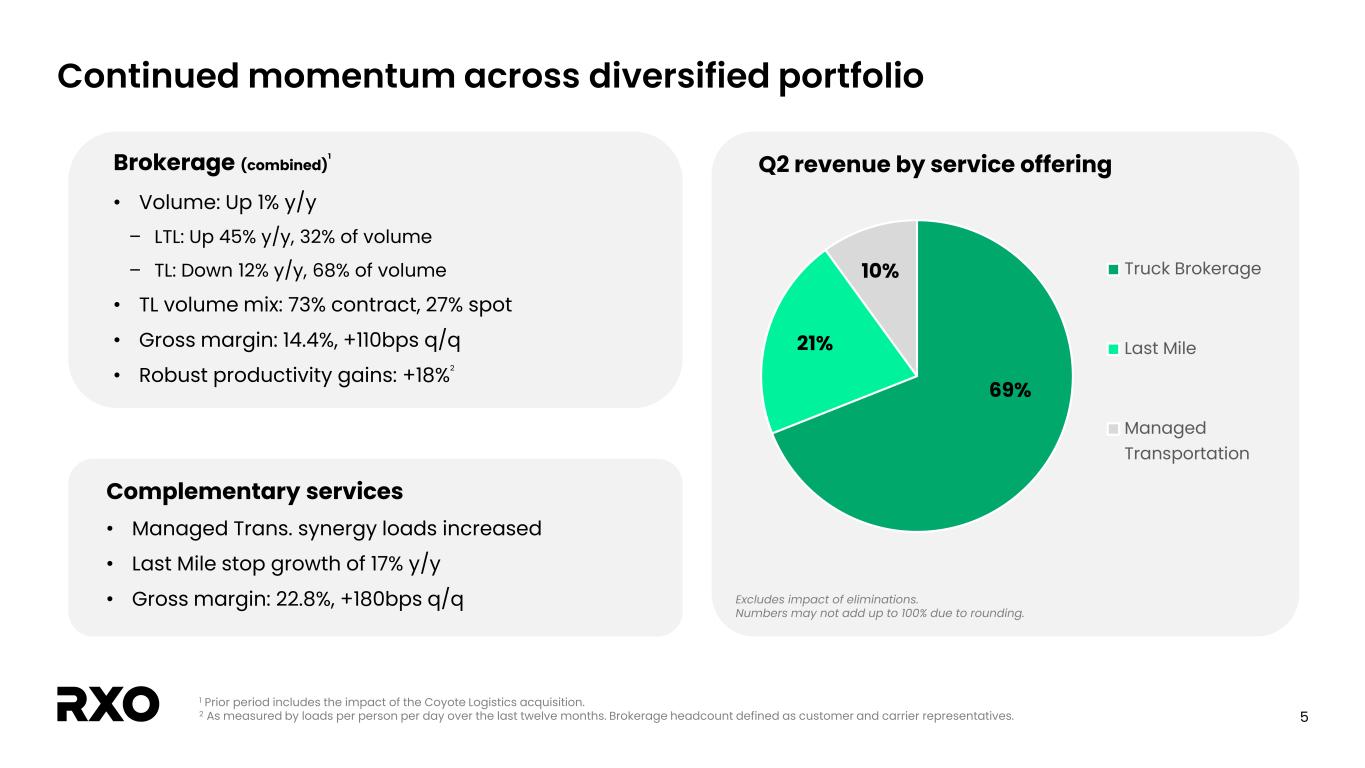 4 $177M $252M Q2 24 Q2 25 As reported Q2 financial results RXO reported adjusted EBITDA of $38M Adjusted EBITDA2Gross margin 1 Q2 2024 revenue, gross margin and adjusted EBITDA represent legacy RXO only. 2 See the “Non-GAAP financial measures” section. $28M $38M Q2 24 Q2 25 3.0% 2.7%19.0% Revenue $930M $1,419M Q2 24 Q2 25 17.8% 1