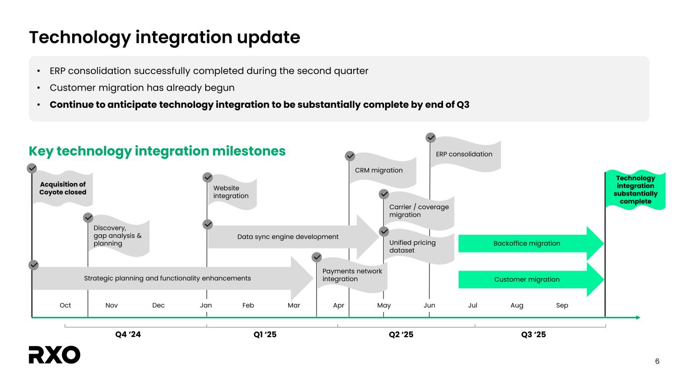 5 Continued momentum across diversified portfolio Q2 revenue by service offering 69% 21% 10% Truck Brokerage Last Mile Managed Transportation Excludes impact of eliminations. Numbers may not add up to 100% due to rounding. Brokerage (combined) 1 • Volume: Up 1% y/y – LTL: Up 45% y/y, 32% of volume – TL: Down 12% y/y, 68% of volume • TL volume mix: 73% contract, 27% spot • Gross margin: 14.4%, +110bps q/q • Robust productivity gains: +18%2 Complementary services • Managed Trans. synergy loads increased • Last Mile stop growth of 17% y/y • Gross margin: 22.8%, +180bps q/q 1 Prior period includes the impact of the Coyote Logistics acquisition. 2 As measured by loads per person per day over the last twelve months. Brokerage headcount defined as customer and carrier representatives.