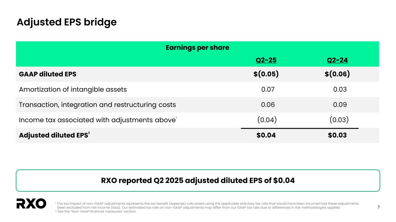 6 Customer migration Backoffice migration ERP consolidation Technology integration update • ERP consolidation successfully completed during the second quarter • Customer migration has already begun • Continue to anticipate technology integration to be substantially complete by end of Q3 Q4 ‘24 Q1 ‘25 Q2 ‘25 Q3 ‘25 Key technology integration milestones Carrier / coverage migration CRM migration Discovery, gap analysis & planning Oct Nov AprFeb Mar JulMay Jun Aug SepDec Website integration Payments network integration Jan Unified pricing dataset Acquisition of Coyote closed Technology integration substantially complete Strategic planning and functionality enhancements Data sync engine development
