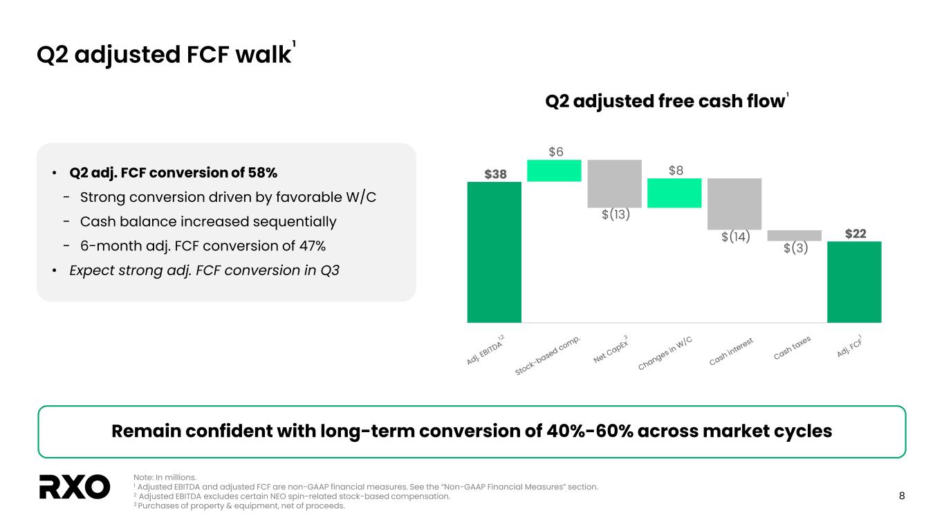 7 Adjusted EPS bridge Earnings per share Q2-25 Q2-24 GAAP diluted EPS $(0.05) $(0.06) Amortization of intangible assets 0.07 0.03 Transaction, integration and restructuring costs 0.06 0.09 Income tax associated with adjustments above1 (0.04) (0.03) Adjusted diluted EPS2 $0.04 $0.03 RXO reported Q2 2025 adjusted diluted EPS of $0.04 1 The tax impact of non-GAAP adjustments represents the tax benefit (expense) calculated using the applicable statutory tax rate that would have been incurred had these adjustments been excluded from net income (loss). Our estimated tax rate on non-GAAP adjustments may differ from our GAAP tax rate due to differences in the methodologies applied. 2 See the “Non-GAAP financial measures” section.