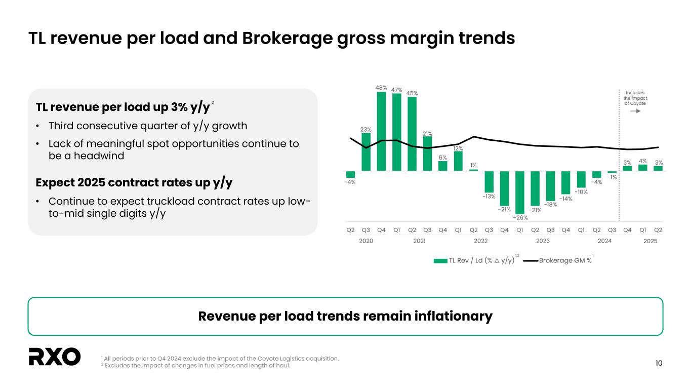 9 Q2 capital structure snapshot Capital structure Q2 2025 Notes due 2027 $ 355 Finance leases, asset financing, ST debt & other 66 Total debt, principal balance & other $ 421 Less: cash 18 Net debt1 $ 403 Committed liquidity Q2 2025 Cash $ 18 Revolver 565 Total capacity $ 583 Note: In millions. 1 See the “Non-GAAP financial measures” section. 2 See appendix for leverage calculations. 3 LTM period includes the impact of the Coyote Logistics acquisition. LTM Leverage1,2,3 2.2x 2.1x Gross Net RXO has a strong balance sheet with low leverage and a robust liquidity position