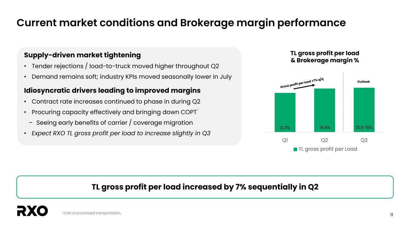 10 TL revenue per load and Brokerage gross margin trends Revenue per load trends remain inflationary TL revenue per load up 3% y/y • Third consecutive quarter of y/y growth • Lack of meaningful spot opportunities continue to be a headwind Expect 2025 contract rates up y/y • Continue to expect truckload contract rates up low- to-mid single digits y/y 1 All periods prior to Q4 2024 exclude the impact of the Coyote Logistics acquisition. 2 Excludes the impact of changes in fuel prices and length of haul. 2