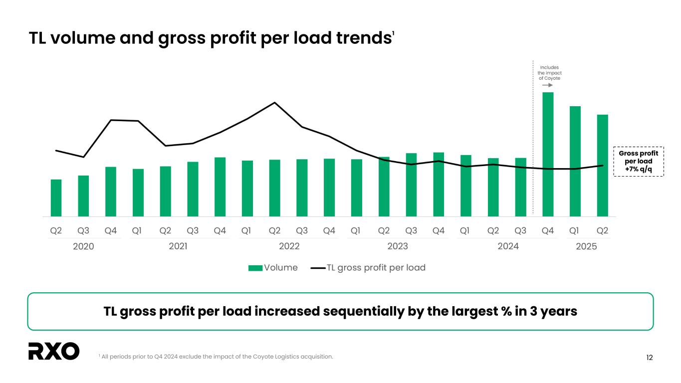 11 Current market conditions and Brokerage margin performance Supply-driven market tightening • Tender rejections / load-to-truck moved higher throughout Q2 • Demand remains soft; industry KPIs moved seasonally lower in July Idiosyncratic drivers leading to improved margins • Contract rate increases continued to phase in during Q2 • Procuring capacity effectively and bringing down COPT – Seeing early benefits of carrier / coverage migration • Expect RXO TL gross profit per load to increase slightly in Q3 TL gross profit per load increased by 7% sequentially in Q2 1 1 Cost of purchased transportation.