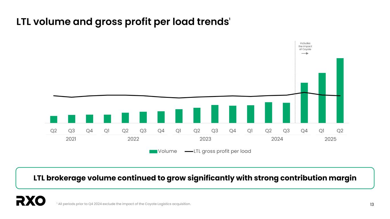 12 TL volume and gross profit per load trends1 1 All periods prior to Q4 2024 exclude the impact of the Coyote Logistics acquisition. TL gross profit per load increased sequentially by the largest % in 3 years