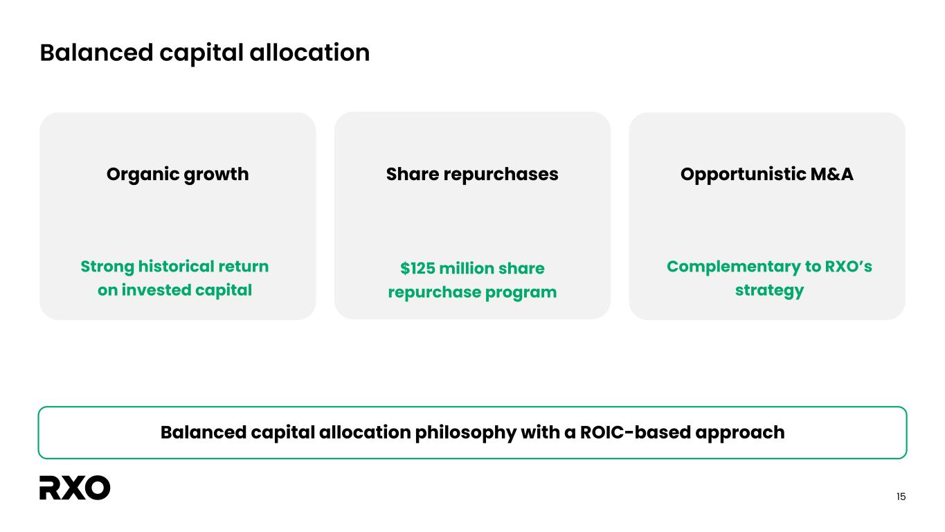 14 Q3 2025 outlook and modeling assumptions • Adjusted EBITDA1 : $33M-$43M • Brokerage y/y volume (combined) 2: ~Flat % • Brokerage gross margin: 13.5%-15.0% Q3 2025 outlook FY 2025 modeling assumptions • Capital expenditures: $65M-$75M • Depreciation: $65M-$75M, Amortization of intangibles: $45M-$50M • Stock-based compensation: $28M-$32M • Restructuring, transaction & integration expenses: $40M-$50M – 2H down significantly vs. 1H • Net interest expense: $32M-$36M • Adjusted effective tax rate: 30%-33% • Fully diluted weighted-average shares outstanding: ~170M 1 See the “Non-GAAP financial measures” section. 2 Prior period includes the impact of the Coyote Logistics acquisition.