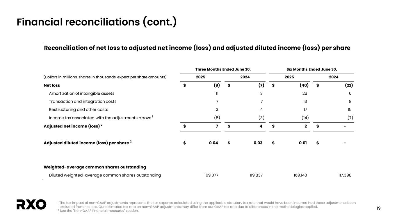 18 Financial reconciliations 1 See the “Non-GAAP financial measures” section. 2 Adjusted EBITDA margin is calculated as adjusted EBITDA divided by revenue. 3 Twelve months ended June 30, 2025 is calculated as the six months ended June 30, 2025 plus the year ended December 31, 2024 less the six months ended June 30, 2024. Reconciliation of net loss to adjusted EBITDA and adjusted EBITDA margin Twelve Months Ended June 30, Year Ended December 31, (Dollars in millions) 2025 2024 2025 2024 2025 3 2024 Net loss (9)$ (7)$ (40)$ (22)$ (308)$ (290)$ Interest expense, net 8 8 17 16 31 30 Income tax benefit (1) (1) (9) (7) (16) (14) Depreciation and amortization expense 30 17 62 33 116 87 Transaction and integration costs 7 7 13 8 58 53 Restructuring and other costs 3 4 17 15 254 252 Adjusted EBITDA 1 38$ 28$ 60$ 43$ 135$ 118$ Revenue 1,419$ 930$ 2,852$ 1,843$ 5,559$ 4,550$ Adjusted EBITDA margin 1, 2 2.7% 3.0% 2.1% 2.3% 2.4% 2.6% Three Months Ended June 30, Six Months Ended June 30,