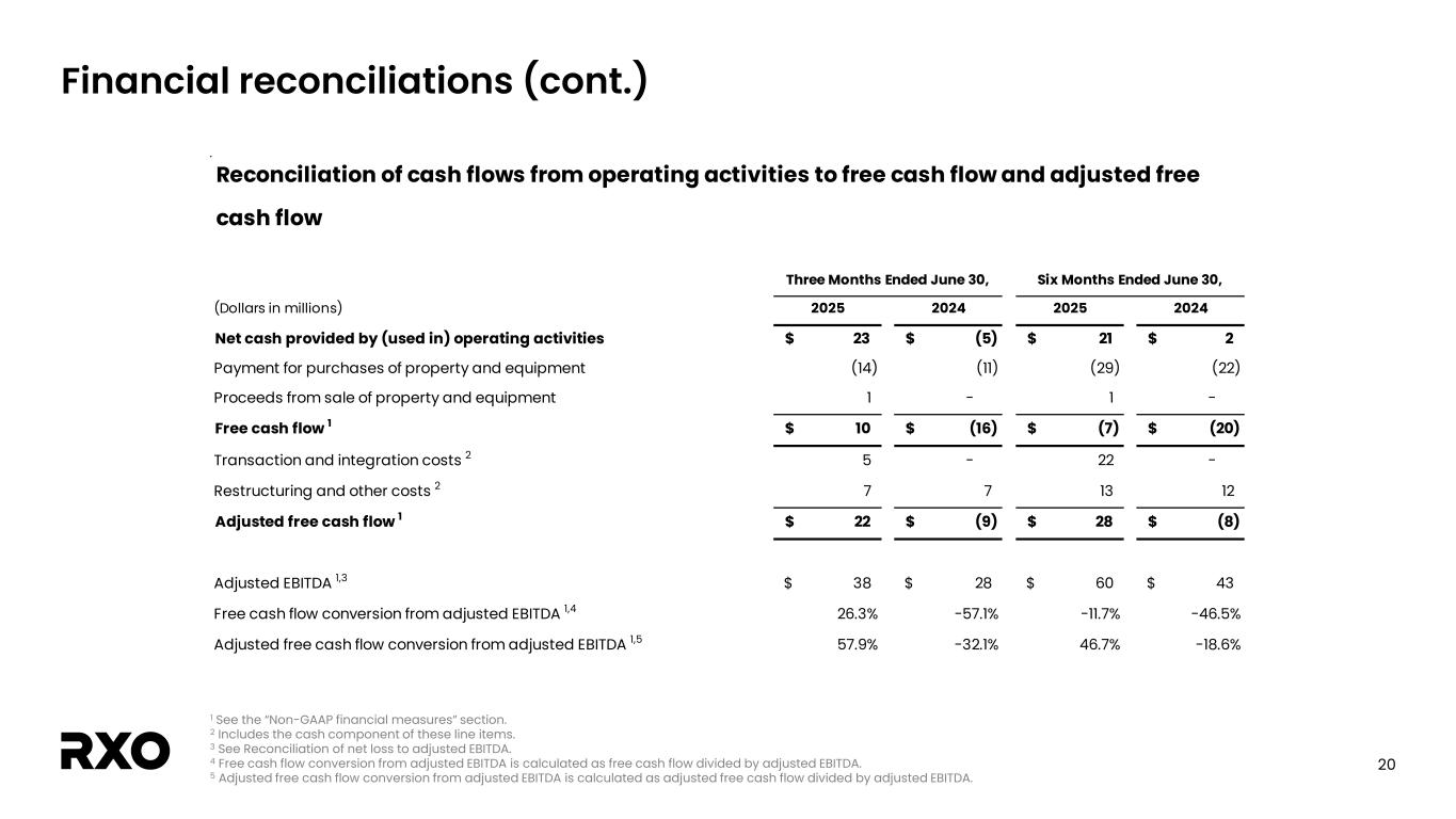 19 Financial reconciliations (cont.) 1 The tax impact of non-GAAP adjustments represents the tax expense calculated using the applicable statutory tax rate that would have been incurred had these adjustments been excluded from net loss. Our estimated tax rate on non-GAAP adjustments may differ from our GAAP tax rate due to differences in the methodologies applied. 2 See the "Non-GAAP financial measures" section. (Dollars in millions, shares in thousands, expect per share amounts) 2025 2024 2025 2024 Net loss (9)$ (7)$ (40)$ (22)$ Amortization of intangible assets 11 3 26 6 Transaction and integration costs 7 7 13 8 Restructuring and other costs 3 4 17 15 Income tax associated with the adjustments above 1 (5) (3) (14) (7) Adjusted net income (loss) 2 7$ 4$ 2$ -$ Adjusted diluted income (loss) per share 2 0.04$ 0.03$ 0.01$ -$ Weighted-average common shares outstanding Diluted weighted-average common shares outstanding 169,077 119,837 169,143 117,398 Reconciliation of net loss to adjusted net income (loss) and adjusted diluted income (loss) per share Three Months Ended June 30, Six Months Ended June 30,