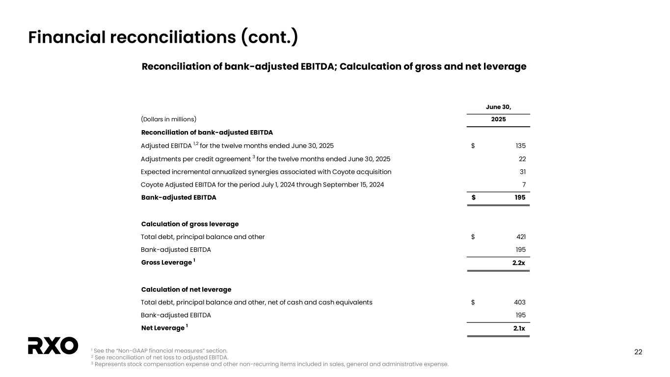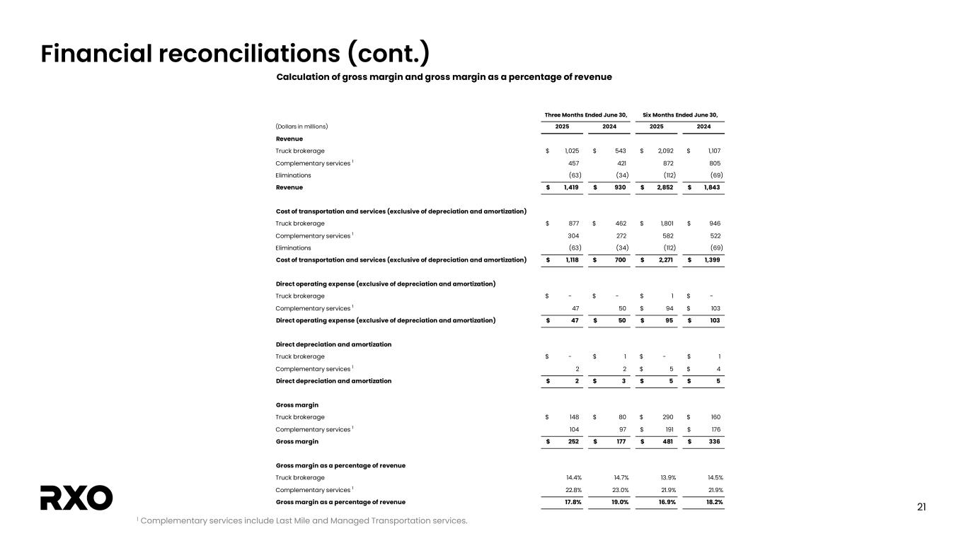 21 Financial reconciliations (cont.) 1 Complementary services include Last Mile and Managed Transportation services. Calculation of gross margin and gross margin as a percentage of revenue (Dollars in millions) 2025 2024 2025 2024 Revenue Truck brokerage 1,025$ 543$ 2,092$ 1,107$ Complementary services 1 457 421 872 805 Eliminations (63) (34) (112) (69) Revenue 1,419$ 930$ 2,852$ 1,843$ Cost of transportation and services (exclusive of depreciation and amortization) Truck brokerage 877$ 462$ 1,801$ 946$ Complementary services 1 304 272 582 522 Eliminations (63) (34) (112) (69) Cost of transportation and services (exclusive of depreciation and amortization) 1,118$ 700$ 2,271$ 1,399$ Direct operating expense (exclusive of depreciation and amortization) Truck brokerage -$ -$ 1$ -$ Complementary services 1 47 50 94$ 103$ Direct operating expense (exclusive of depreciation and amortization) 47$ 50$ 95$ 103$ Direct depreciation and amortization Truck brokerage -$ 1$ -$ 1$ Complementary services 1 2 2 5$ 4$ Direct depreciation and amortization 2$ 3$ 5$ 5$ Gross margin Truck brokerage 148$ 80$ 290$ 160$ Complementary services 1 104 97 191$ 176$ Gross margin 252$ 177$ 481$ 336$ Gross margin as a percentage of revenue Truck brokerage 14.4% 14.7% 13.9% 14.5% Complementary services 1 22.8% 23.0% 21.9% 21.9% Gross margin as a percentage of revenue 17.8% 19.0% 16.9% 18.2% Three Months Ended June 30, Six Months Ended June 30,