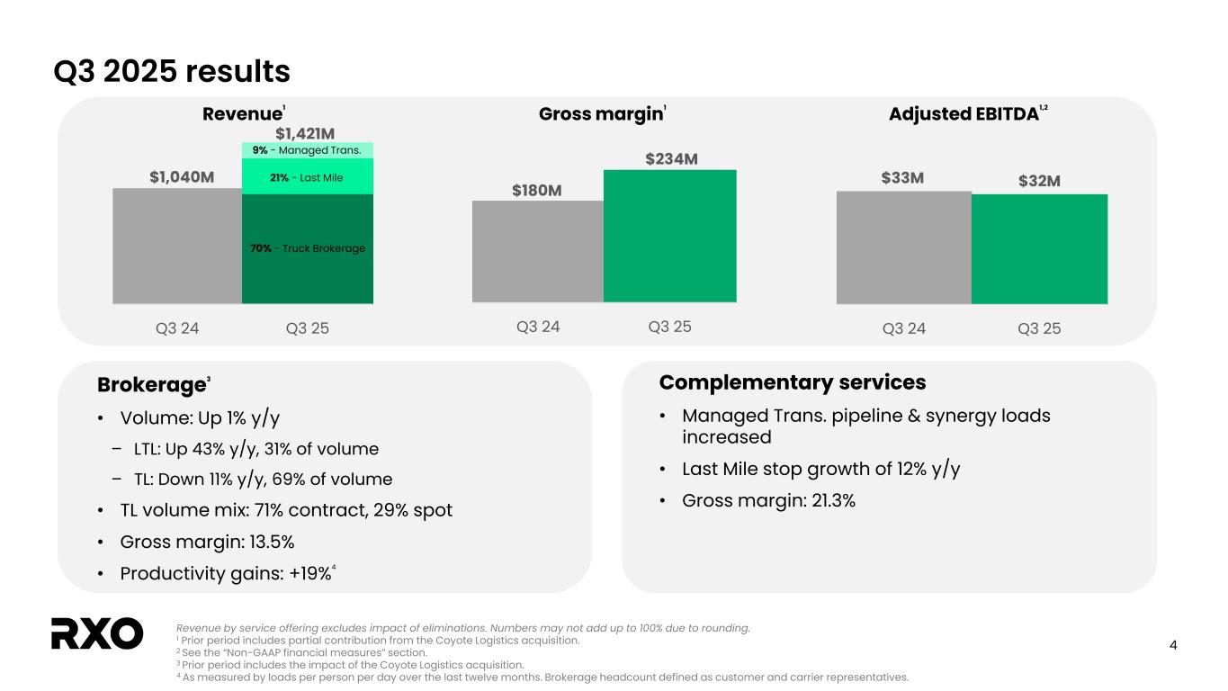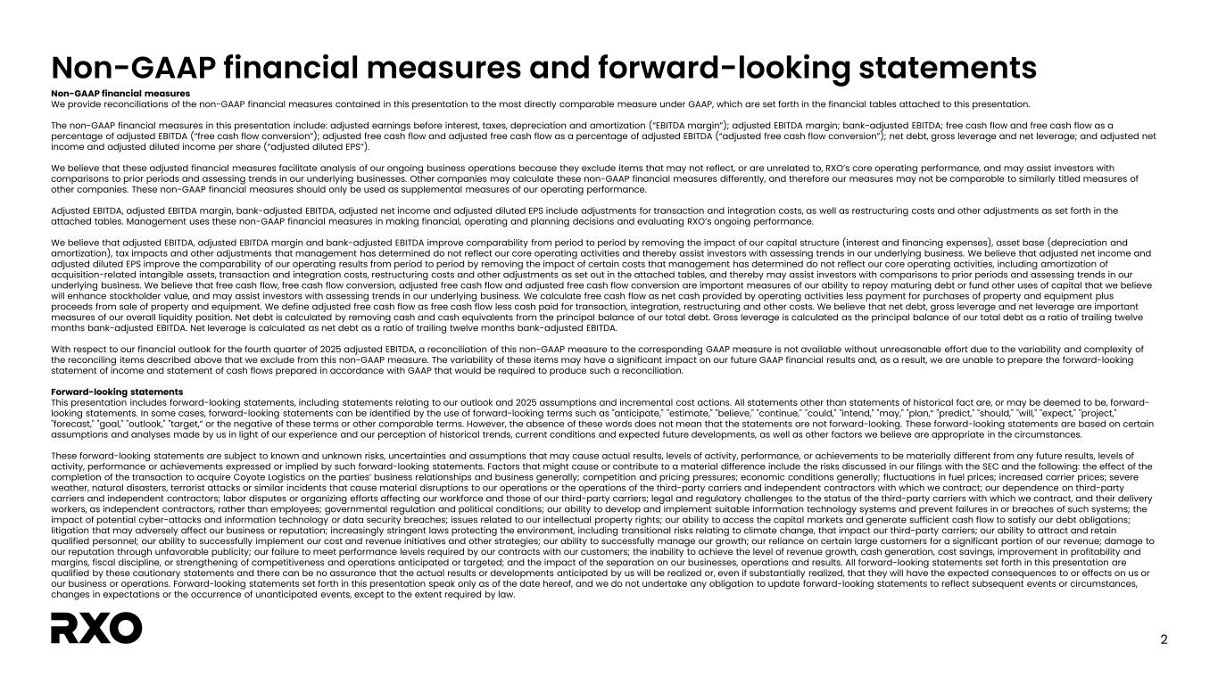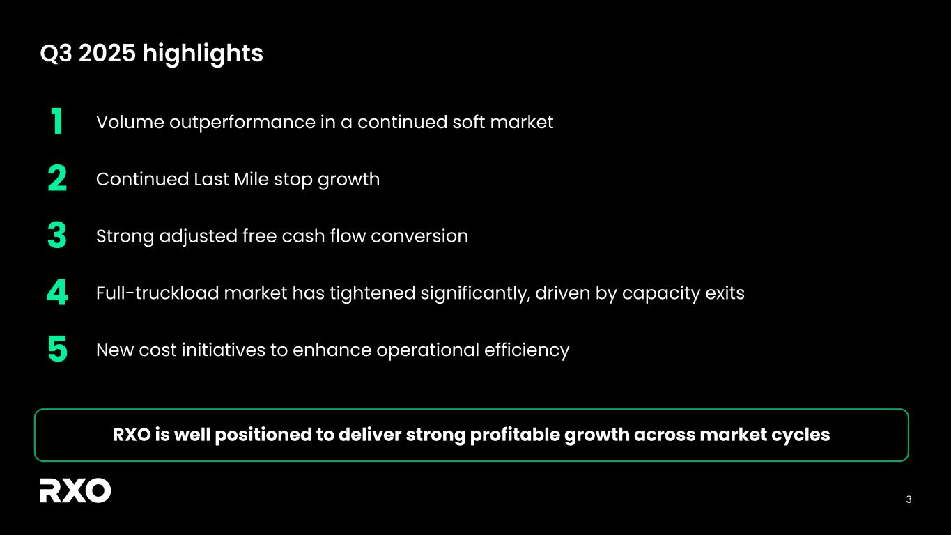 2 Non-GAAP financial measures and forward-looking statements Non-GAAP financial measures We provide reconciliations of the non-GAAP financial measures contained in this presentation to the most directly comparable measure under GAAP, which are set forth in the financial tables attached to this presentation. The non-GAAP financial measures in this presentation include: adjusted earnings before interest, taxes, depreciation and amortization (“EBITDA margin”); adjusted EBITDA margin; bank-adjusted EBITDA; free cash flow and free cash flow as a percentage of adjusted EBITDA (“free cash flow conversion”); adjusted free cash flow and adjusted free cash flow as a percentage of adjusted EBITDA (“adjusted free cash flow conversion”); net debt, gross leverage and net leverage; and adjusted net income and adjusted diluted income per share (“adjusted diluted EPS”). We believe that these adjusted financial measures facilitate analysis of our ongoing business operations because they exclude items that may not reflect, or are unrelated to, RXO’s core operating performance, and may assist investors with comparisons to prior periods and assessing trends in our underlying businesses. Other companies may calculate these non-GAAP financial measures differently, and therefore our measures may not be comparable to similarly titled measures of other companies. These non-GAAP financial measures should only be used as supplemental measures of our operating performance. Adjusted EBITDA, adjusted EBITDA margin, bank-adjusted EBITDA, adjusted net income and adjusted diluted EPS include adjustments for transaction and integration costs, as well as restructuring costs and other adjustments as set forth in the attached tables. Management uses these non-GAAP financial measures in making financial, operating and planning decisions and evaluating RXO’s ongoing performance. We believe that adjusted EBITDA, adjusted EBITDA margin and bank-adjusted EBITDA improve comparability from period to period by removing the impact of our capital structure (interest and financing expenses), asset base (depreciation and amortization), tax impacts and other adjustments that management has determined do not reflect our core operating activities and thereby assist investors with assessing trends in our underlying business. We believe that adjusted net income and adjusted diluted EPS improve the comparability of our operating results from period to period by removing the impact of certain costs that management has determined do not reflect our core operating activities, including amortization of acquisition-related intangible assets, transaction and integration costs, restructuring costs and other adjustments as set out in the attached tables, and thereby may assist investors with comparisons to prior periods and assessing trends in our underlying business. We believe that free cash flow, free cash flow conversion, adjusted free cash flow and adjusted free cash flow conversion are important measures of our ability to repay maturing debt or fund other uses of capital that we believe will enhance stockholder value, and may assist investors with assessing trends in our underlying business. We calculate free cash flow as net cash provided by operating activities less payment for purchases of property and equipment plus proceeds from sale of property and equipment. We define adjusted free cash flow as free cash flow less cash paid for transaction, integration, restructuring and other costs. We believe that net debt, gross leverage and net leverage are important measures of our overall liquidity position. Net debt is calculated by removing cash and cash equivalents from the principal balance of our total debt. Gross leverage is calculated as the principal balance of our total debt as a ratio of trailing twelve months bank-adjusted EBITDA. Net leverage is calculated as net debt as a ratio of trailing twelve months bank-adjusted EBITDA. With respect to our financial outlook for the fourth quarter of 2025 adjusted EBITDA, a reconciliation of this non-GAAP measure to the corresponding GAAP measure is not available without unreasonable effort due to the variability and complexity of the reconciling items described above that we exclude from this non-GAAP measure. The variability of these items may have a significant impact on our future GAAP financial results and, as a result, we are unable to prepare the forward-looking statement of income and statement of cash flows prepared in accordance with GAAP that would be required to produce such a reconciliation. Forward-looking statements This presentation includes forward-looking statements, including statements relating to our outlook and 2025 assumptions and incremental cost actions. All statements other than statements of historical fact are, or may be deemed to be, forward- looking statements. In some cases, forward-looking statements can be identified by the use of forward-looking terms such as "anticipate," "estimate," "believe," "continue," "could," "intend," "may," "plan,“ "predict," "should," "will," "expect," "project," "forecast," "goal," "outlook," "target,” or the negative of these terms or other comparable terms. However, the absence of these words does not mean that the statements are not forward-looking. These forward-looking statements are based on certain assumptions and analyses made by us in light of our experience and our perception of historical trends, current conditions and expected future developments, as well as other factors we believe are appropriate in the circumstances. These forward-looking statements are subject to known and unknown risks, uncertainties and assumptions that may cause actual results, levels of activity, performance, or achievements to be materially different from any future results, levels of activity, performance or achievements expressed or implied by such forward-looking statements. Factors that might cause or contribute to a mater