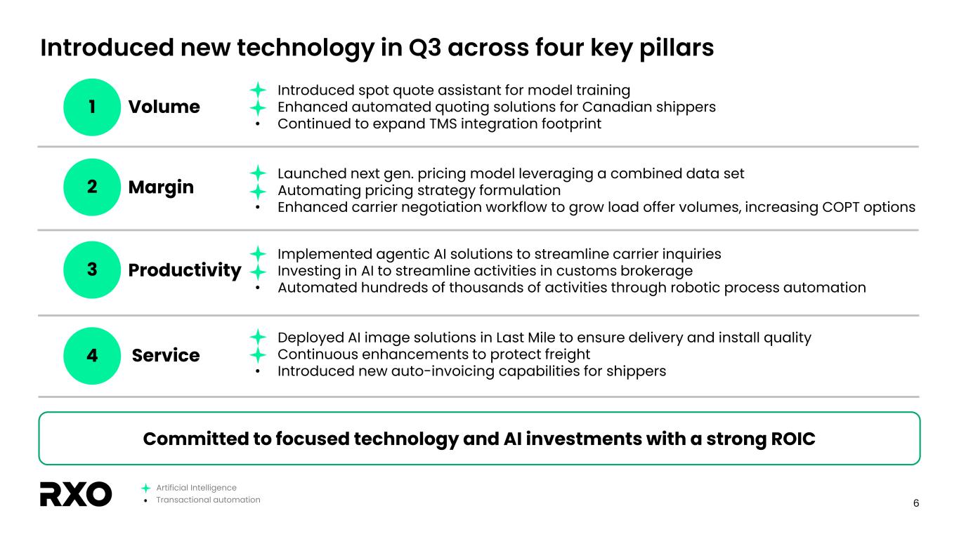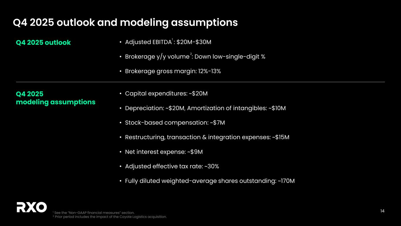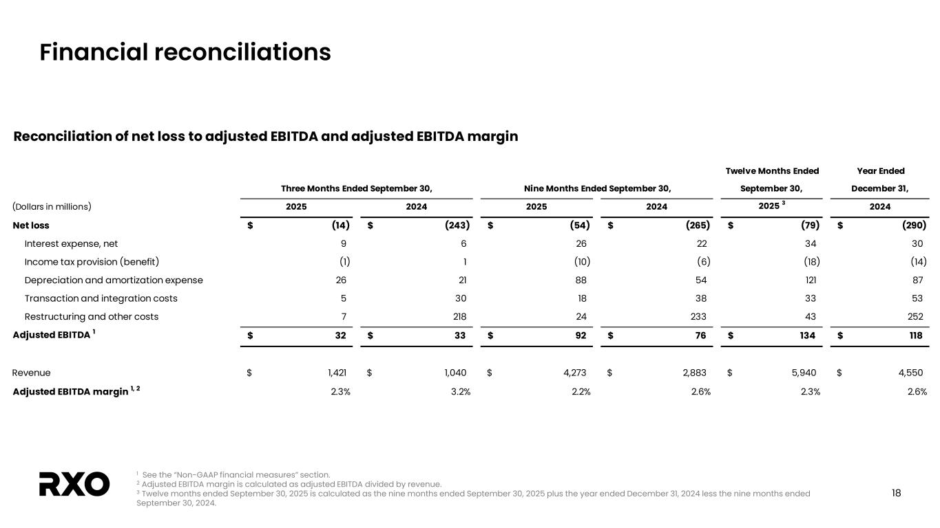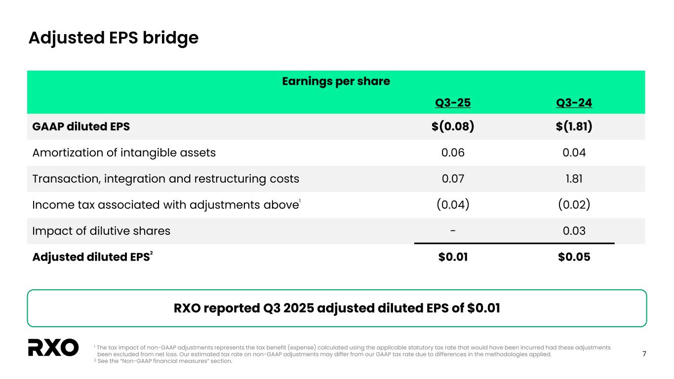 2 Non-GAAP financial measures and forward-looking statements Non-GAAP financial measures We provide reconciliations of the non-GAAP financial measures contained in this presentation to the most directly comparable measure under GAAP, which are set forth in the financial tables attached to this presentation. The non-GAAP financial measures in this presentation include: adjusted earnings before interest, taxes, depreciation and amortization (“EBITDA margin”); adjusted EBITDA margin; bank-adjusted EBITDA; free cash flow and free cash flow as a percentage of adjusted EBITDA (“free cash flow conversion”); adjusted free cash flow and adjusted free cash flow as a percentage of adjusted EBITDA (“adjusted free cash flow conversion”); net debt, gross leverage and net leverage; and adjusted net income and adjusted diluted income per share (“adjusted diluted EPS”). We believe that these adjusted financial measures facilitate analysis of our ongoing business operations because they exclude items that may not reflect, or are unrelated to, RXO’s core operating performance, and may assist investors with comparisons to prior periods and assessing trends in our underlying businesses. Other companies may calculate these non-GAAP financial measures differently, and therefore our measures may not be comparable to similarly titled measures of other companies. These non-GAAP financial measures should only be used as supplemental measures of our operating performance. Adjusted EBITDA, adjusted EBITDA margin, bank-adjusted EBITDA, adjusted net income and adjusted diluted EPS include adjustments for transaction and integration costs, as well as restructuring costs and other adjustments as set forth in the attached tables. Management uses these non-GAAP financial measures in making financial, operating and planning decisions and evaluating RXO’s ongoing performance. We believe that adjusted EBITDA, adjusted EBITDA margin and bank-adjusted EBITDA improve comparability from period to period by removing the impact of our capital structure (interest and financing expenses), asset base (depreciation and amortization), tax impacts and other adjustments that management has determined do not reflect our core operating activities and thereby assist investors with assessing trends in our underlying business. We believe that adjusted net income and adjusted diluted EPS improve the comparability of our operating results from period to period by removing the impact of certain costs that management has determined do not reflect our core operating activities, including amortization of acquisition-related intangible assets, transaction and integration costs, restructuring costs and other adjustments as set out in the attached tables, and thereby may assist investors with comparisons to prior periods and assessing trends in our underlying business. We believe that free cash flow, free cash flow conversion, adjusted free cash flow and adjusted free cash flow conversion are important measures of our ability to repay maturing debt or fund other uses of capital that we believe will enhance stockholder value, and may assist investors with assessing trends in our underlying business. We calculate free cash flow as net cash provided by operating activities less payment for purchases of property and equipment plus proceeds from sale of property and equipment. We define adjusted free cash flow as free cash flow less cash paid for transaction, integration, restructuring and other costs. We believe that net debt, gross leverage and net leverage are important measures of our overall liquidity position. Net debt is calculated by removing cash and cash equivalents from the principal balance of our total debt. Gross leverage is calculated as the principal balance of our total debt as a ratio of trailing twelve months bank-adjusted EBITDA. Net leverage is calculated as net debt as a ratio of trailing twelve months bank-adjusted EBITDA. With respect to our financial outlook for the fourth quarter of 2025 adjusted EBITDA, a reconciliation of this non-GAAP measure to the corresponding GAAP measure is not available without unreasonable effort due to the variability and complexity of the reconciling items described above that we exclude from this non-GAAP measure. The variability of these items may have a significant impact on our future GAAP financial results and, as a result, we are unable to prepare the forward-looking statement of income and statement of cash flows prepared in accordance with GAAP that would be required to produce such a reconciliation. Forward-looking statements This presentation includes forward-looking statements, including statements relating to our outlook and 2025 assumptions and incremental cost actions. All statements other than statements of historical fact are, or may be deemed to be, forward- looking statements. In some cases, forward-looking statements can be identified by the use of forward-looking terms such as "anticipate," "estimate," "believe," "continue," "could," "intend," "may," "plan,“ "predict," "should," "will," "expect," "project," "forecast," "goal," "outlook," "target,” or the negative of these terms or other comparable terms. However, the absence of these words does not mean that the statements are not forward-looking. These forward-looking statements are based on certain assumptions and analyses made by us in light of our experience and our perception of historical trends, current conditions and expected future developments, as well as other factors we believe are appropriate in the circumstances. These forward-looking statements are subject to known and unknown risks, uncertainties and assumptions that may cause actual results, levels of activity, performance, or achievements to be materially different from any future results, levels of activity, performance or achievements expressed or implied by such forward-looking statements. Factors that might cause or contribute to a mater