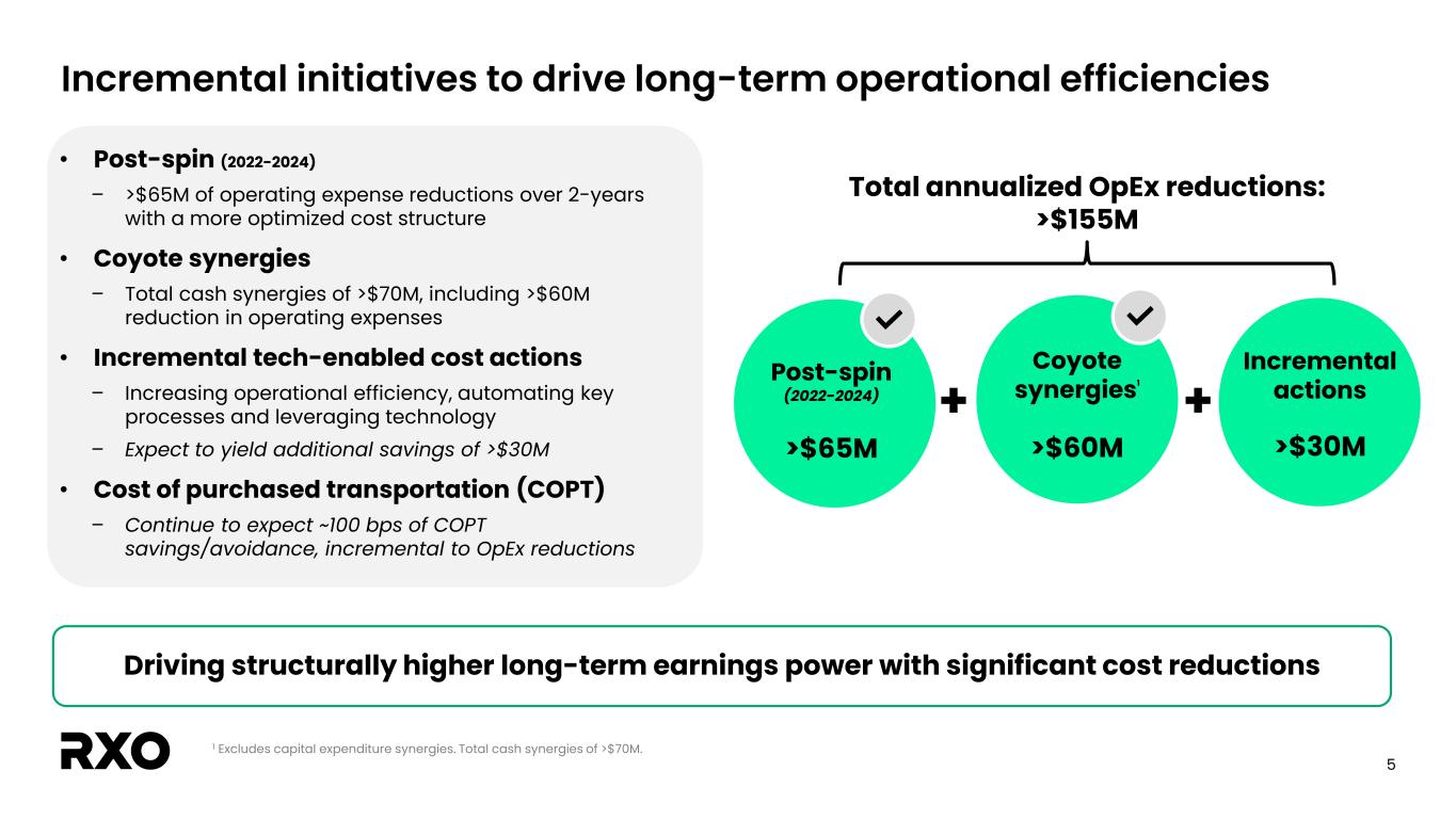 4 Q3 2025 results Revenue by service offering excludes impact of eliminations. Numbers may not add up to 100% due to rounding. 1 Prior period includes partial contribution from the Coyote Logistics acquisition. 2 See the “Non-GAAP financial measures” section. 3 Prior period includes the impact of the Coyote Logistics acquisition. 4 As measured by loads per person per day over the last twelve months. Brokerage headcount defined as customer and carrier representatives. Brokerage3 • Volume: Up 1% y/y – LTL: Up 43% y/y, 31% of volume – TL: Down 11% y/y, 69% of volume • TL volume mix: 71% contract, 29% spot • Gross margin: 13.5% • Productivity gains: +19%4 Complementary services • Managed Trans. pipeline & synergy loads increased • Last Mile stop growth of 12% y/y • Gross margin: 21.3% $1,040M Q3 24 Q3 25 $1,421M $180M $234M Q3 24 Q3 25 $33M $32M Q3 24 Q3 25 Revenue1 Gross margin1 Adjusted EBITDA1,2 70% - Truck Brokerage 21% - Last Mile 9% - Managed Trans.