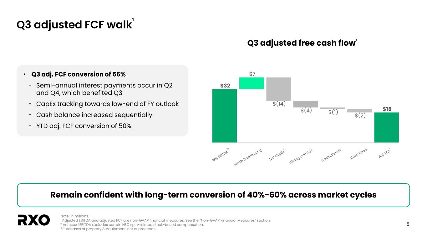 7 Adjusted EPS bridge Earnings per share Q3-25 Q3-24 GAAP diluted EPS $(0.08) $(1.81) Amortization of intangible assets 0.06 0.04 Transaction, integration and restructuring costs 0.07 1.81 Income tax associated with adjustments above1 (0.04) (0.02) Impact of dilutive shares - 0.03 Adjusted diluted EPS2 $0.01 $0.05 RXO reported Q3 2025 adjusted diluted EPS of $0.01 1 The tax impact of non-GAAP adjustments represents the tax benefit (expense) calculated using the applicable statutory tax rate that would have been incurred had these adjustments been excluded from net loss. Our estimated tax rate on non-GAAP adjustments may differ from our GAAP tax rate due to differences in the methodologies applied. 2 See the “Non-GAAP financial measures” section.
