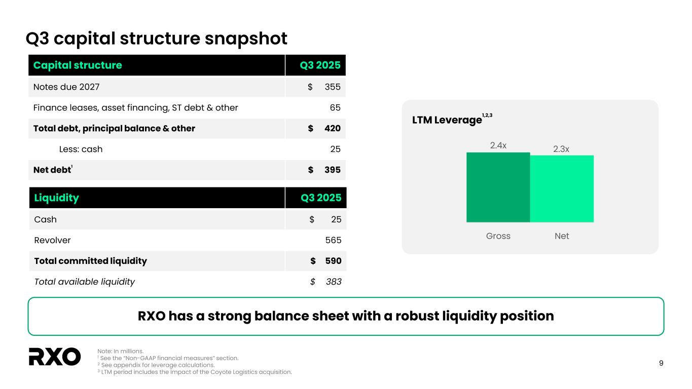 8 $7 $(14) $(4) $(1) $(2) $32 $18 Adj. EBITDA Stock-based … Net CapEx Changes in W/C Cash interest Cash taxes RXO Adj. FCF Q3 adjusted FCF walk Note: In millions. 1 Adjusted EBITDA and adjusted FCF are non-GAAP financial measures. See the “Non-GAAP Financial Measures” section. 2 Adjusted EBITDA excludes certain NEO spin-related stock-based compensation. 3 Purchases of property & equipment, net of proceeds. Remain confident with long-term conversion of 40%-60% across market cycles Q3 adjusted free cash flow1 1 • Q3 adj. FCF conversion of 56% − Semi-annual interest payments occur in Q2 and Q4, which benefited Q3 − CapEx tracking towards low-end of FY outlook − Cash balance increased sequentially − YTD adj. FCF conversion of 50%