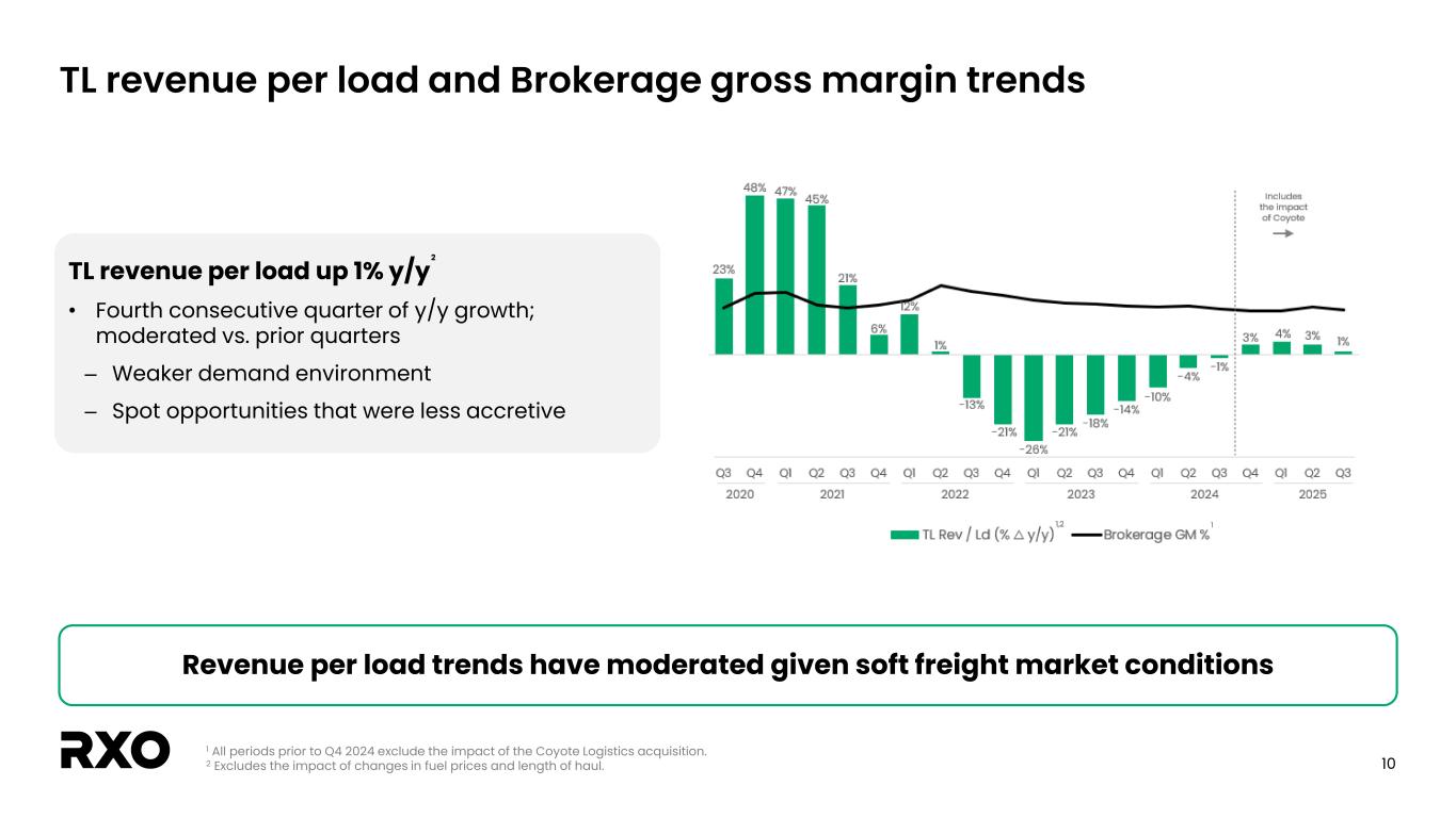 9 Q3 capital structure snapshot Capital structure Q3 2025 Notes due 2027 $ 355 Finance leases, asset financing, ST debt & other 65 Total debt, principal balance & other $ 420 Less: cash 25 Net debt1 $ 395 Note: In millions. 1 See the “Non-GAAP financial measures” section. 2 See appendix for leverage calculations. 3 LTM period includes the impact of the Coyote Logistics acquisition. LTM Leverage1,2,3 2.4x 2.3x Gross Net RXO has a strong balance sheet with a robust liquidity position Liquidity Q3 2025 Cash $ 25 Revolver 565 Total committed liquidity $ 590 Total available liquidity $ 383