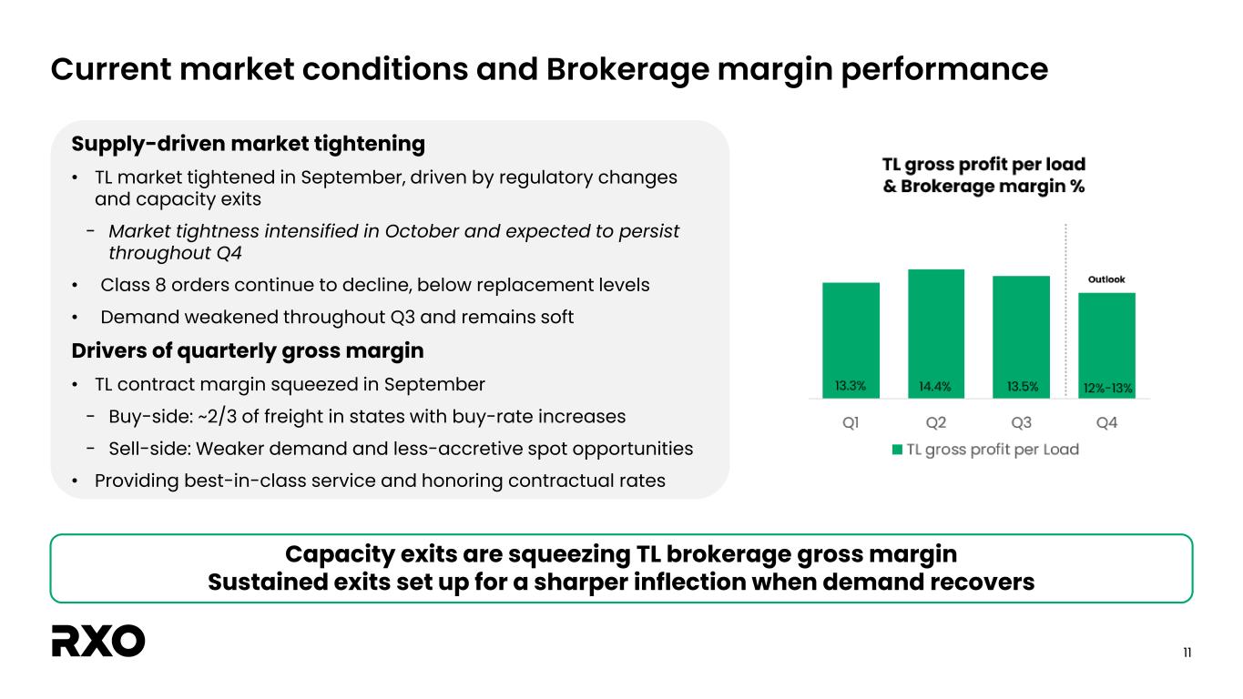 10 TL revenue per load and Brokerage gross margin trends Revenue per load trends have moderated given soft freight market conditions TL revenue per load up 1% y/y • Fourth consecutive quarter of y/y growth; moderated vs. prior quarters – Weaker demand environment – Spot opportunities that were less accretive 1 All periods prior to Q4 2024 exclude the impact of the Coyote Logistics acquisition. 2 Excludes the impact of changes in fuel prices and length of haul. 2