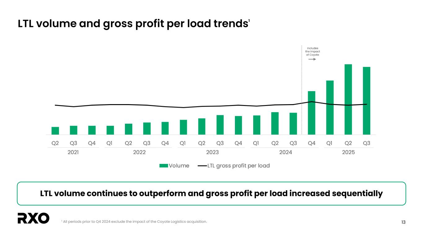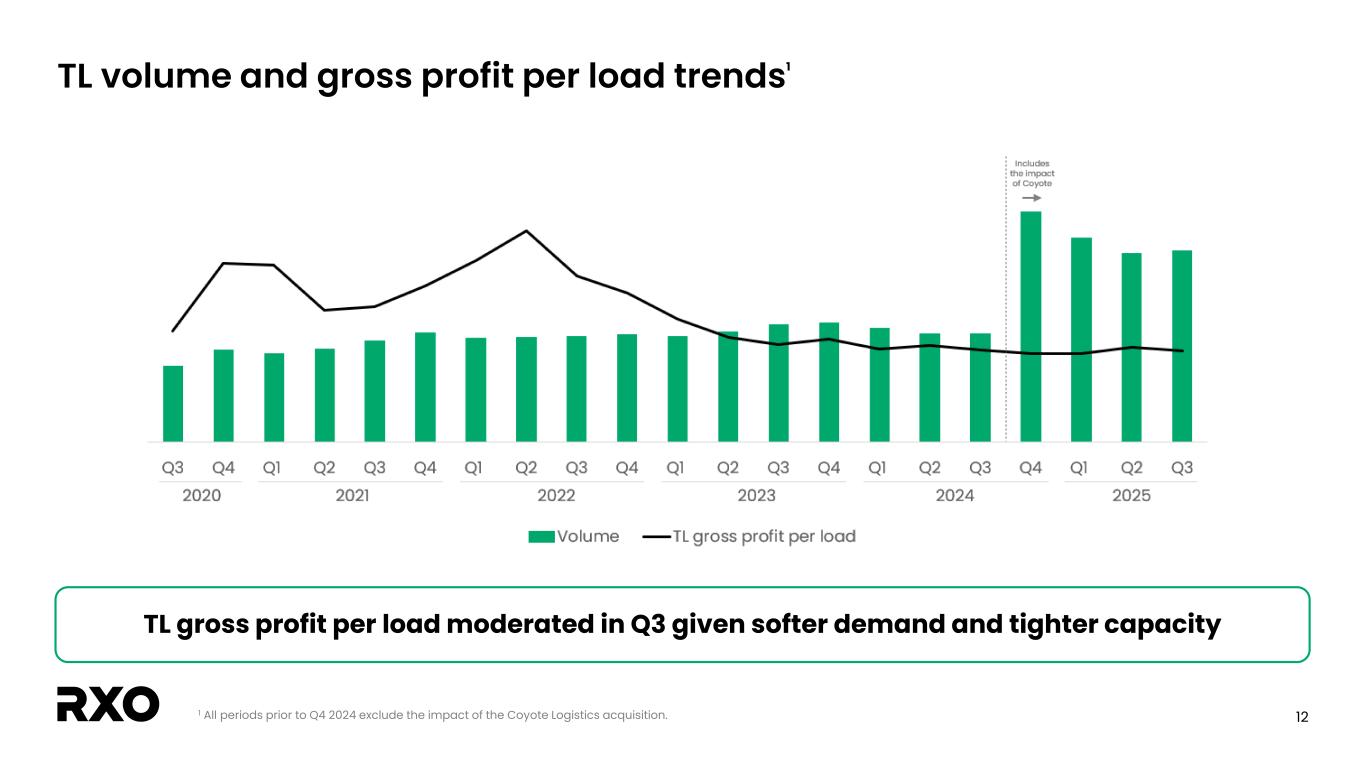 12 TL volume and gross profit per load trends1 1 All periods prior to Q4 2024 exclude the impact of the Coyote Logistics acquisition. TL gross profit per load moderated in Q3 given softer demand and tighter capacity