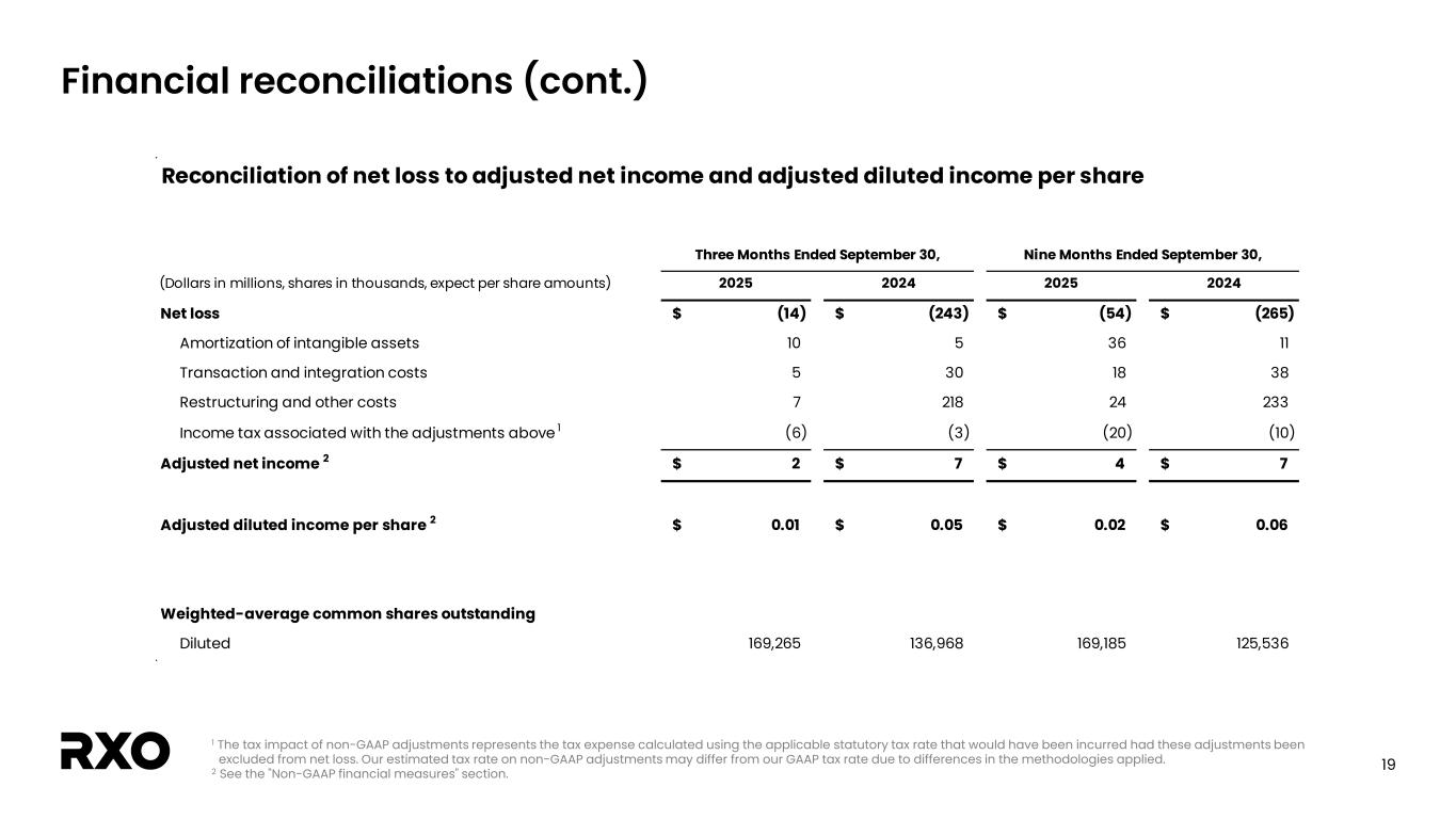 18 Financial reconciliations 1 See the “Non-GAAP financial measures” section. 2 Adjusted EBITDA margin is calculated as adjusted EBITDA divided by revenue. 3 Twelve months ended September 30, 2025 is calculated as the nine months ended September 30, 2025 plus the year ended December 31, 2024 less the nine months ended September 30, 2024. Reconciliation of net loss to adjusted EBITDA and adjusted EBITDA margin Twelve Months Ended September 30, Year Ended December 31, (Dollars in millions) 2025 2024 2025 2024 2025 3 2024 Net loss (14)$ (243)$ (54)$ (265)$ (79)$ (290)$ Interest expense, net 9 6 26 22 34 30 Income tax provision (benefit) (1) 1 (10) (6) (18) (14) Depreciation and amortization expense 26 21 88 54 121 87 Transaction and integration costs 5 30 18 38 33 53 Restructuring and other costs 7 218 24 233 43 252 Adjusted EBITDA 1 32$ 33$ 92$ 76$ 134$ 118$ Revenue 1,421$ 1,040$ 4,273$ 2,883$ 5,940$ 4,550$ Adjusted EBITDA margin 1, 2 2.3% 3.2% 2.2% 2.6% 2.3% 2.6% Three Months Ended September 30, Nine Months Ended September 30,